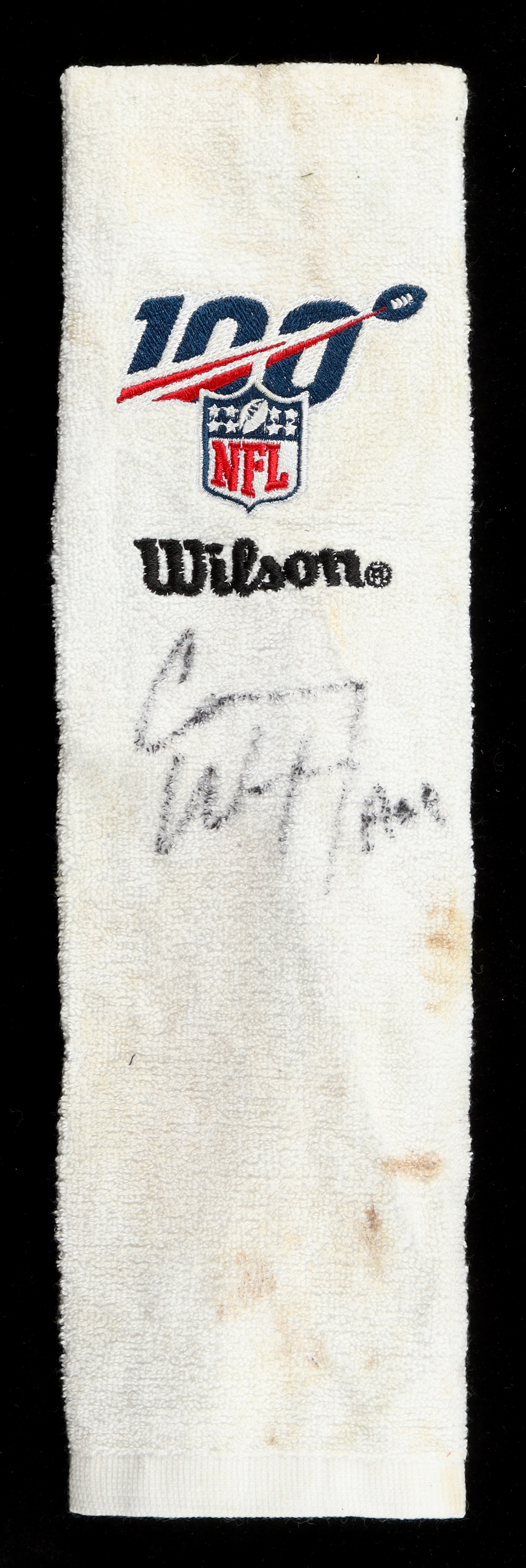 Game-used towel has been hand-signed by Carson Wentz (Philadelphia Eagles). Game-used on September 22, 2019.