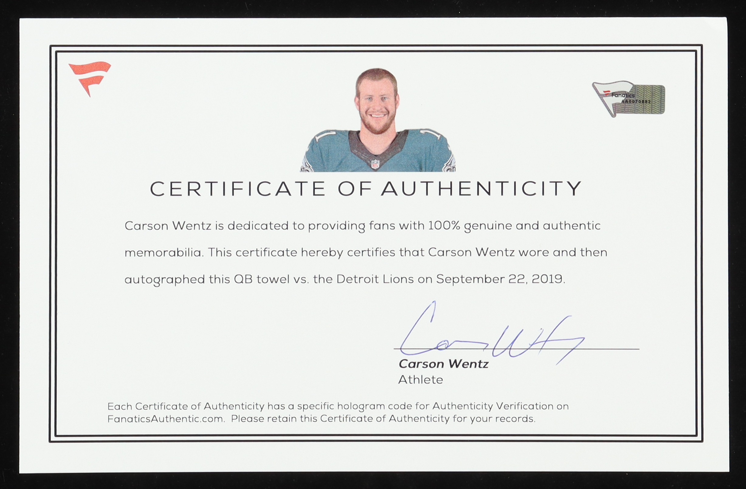COA Signed By Carson Wentz