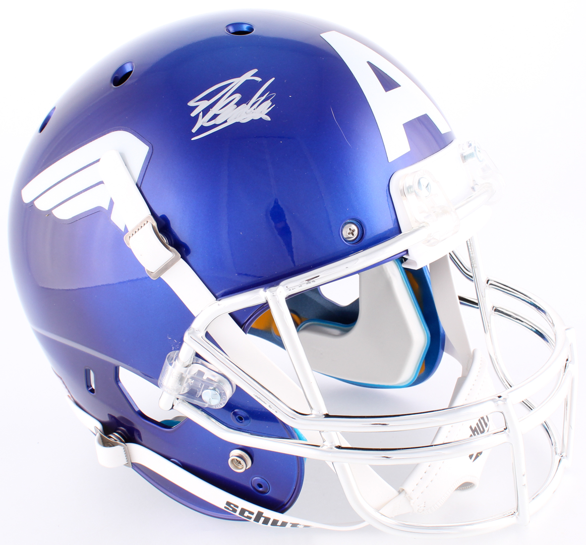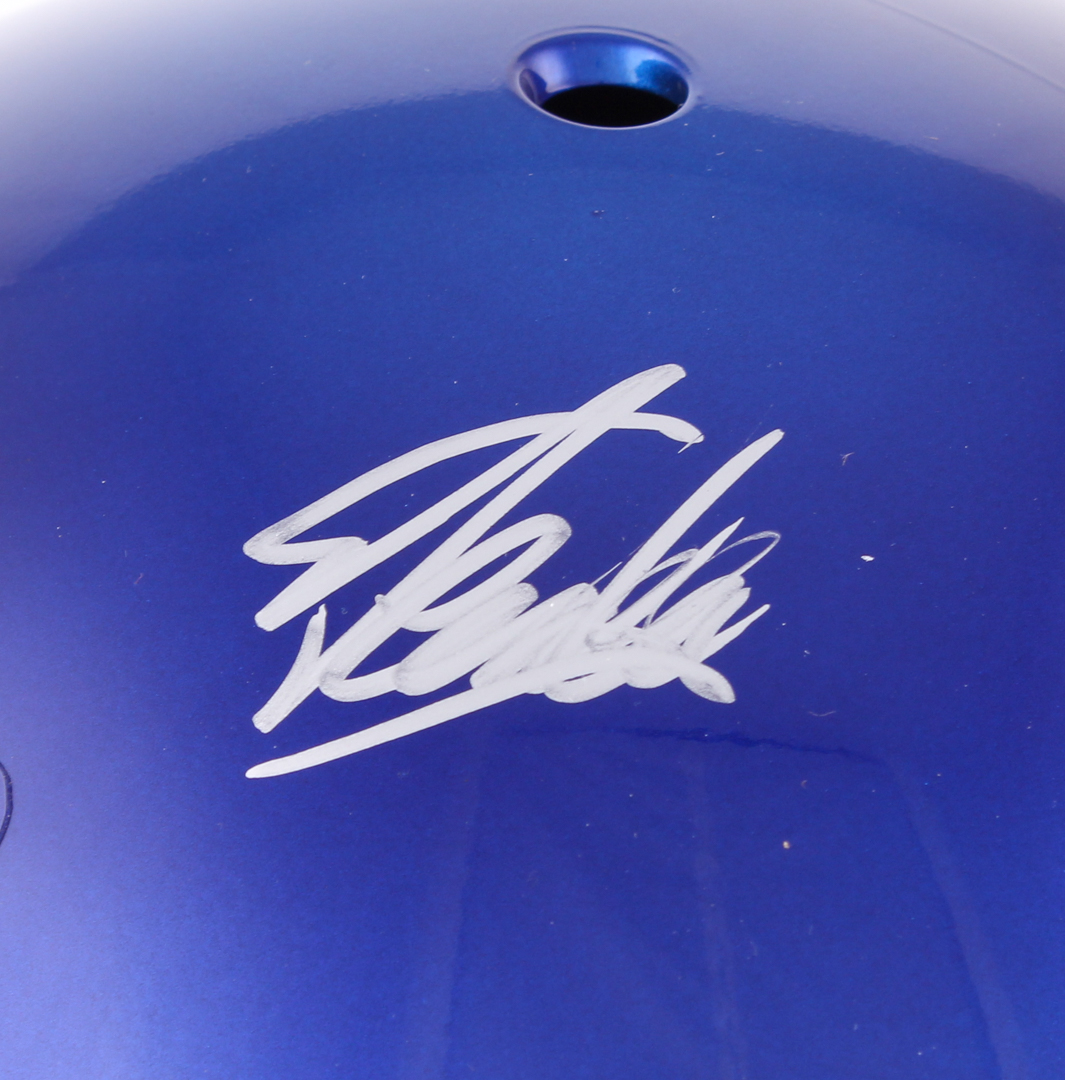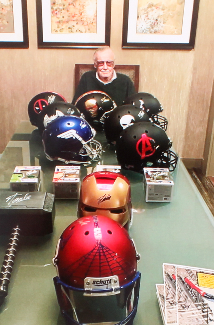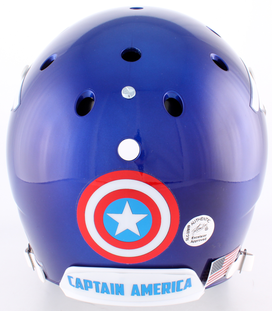 Schutt full-size "Captain America" replica helmet. Hand-signed in silver felt-tip pen by Stan Lee.