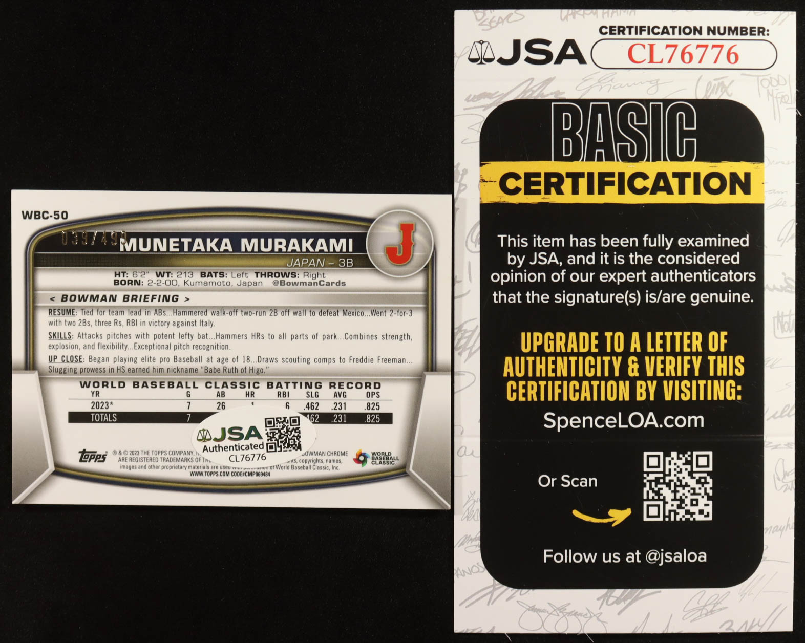 Munetaka Murakami Signed 2023 Bowman Chrome WBC Flag Refractors #WBC50 #039/499 RC (JSA)
