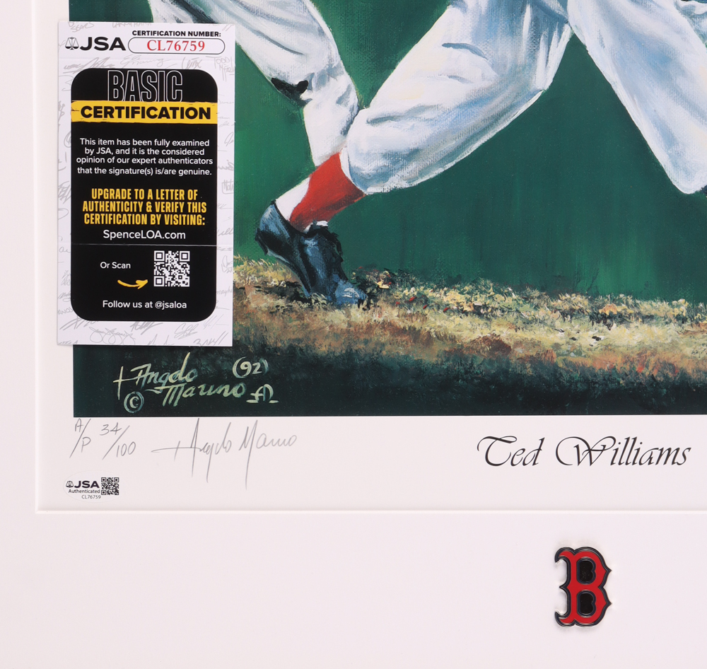 Matted display measures approximately 22" x 28" in size and features an art print depicting Ted Williams (D. 2002, Boston Red Sox, HOF) hand-signed by only the artist Angelo Marino. Art print is limited edition # 34 / 100. Please not the piece is slightly creased, see photos for more details.