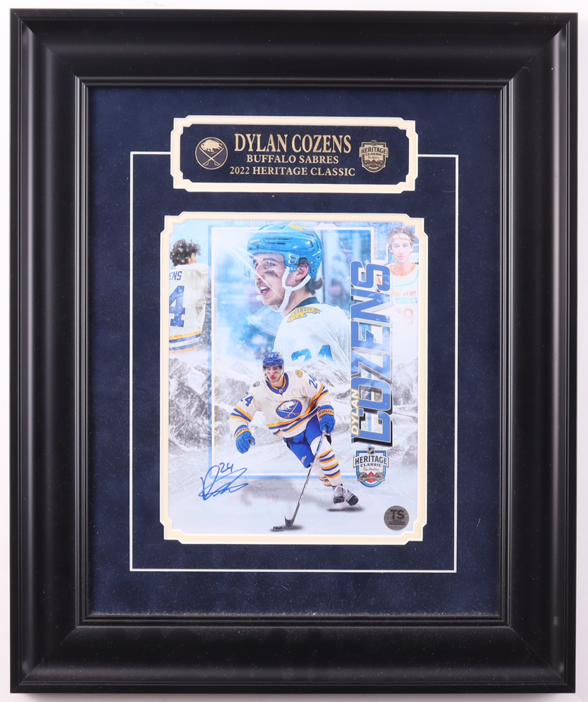 Custom frame measures approximately 17.5" x 21" in size and features a photo that has been hand-signed by Dylan Cozens (Buffalo Sabres). Please note, there is scuffing throughout the frame.