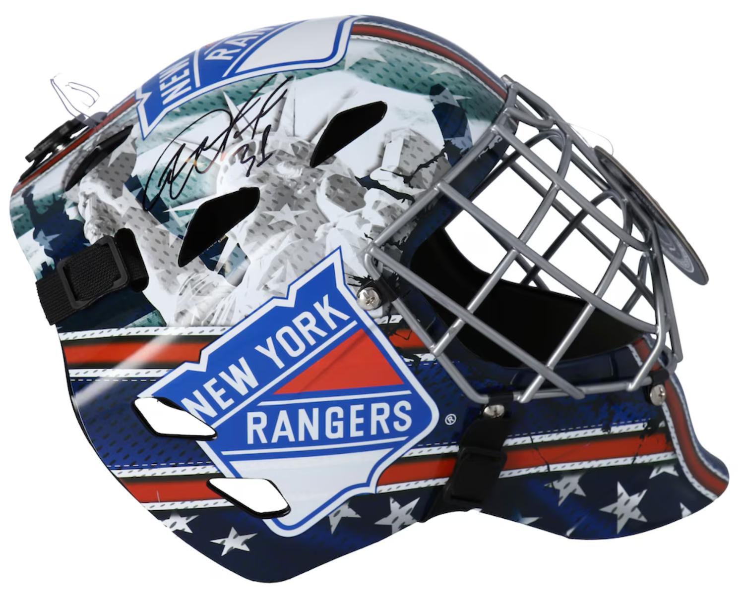 New York Rangers full-size replica hockey goalie mask. Has been hand-signed by Igor Shesterkin.