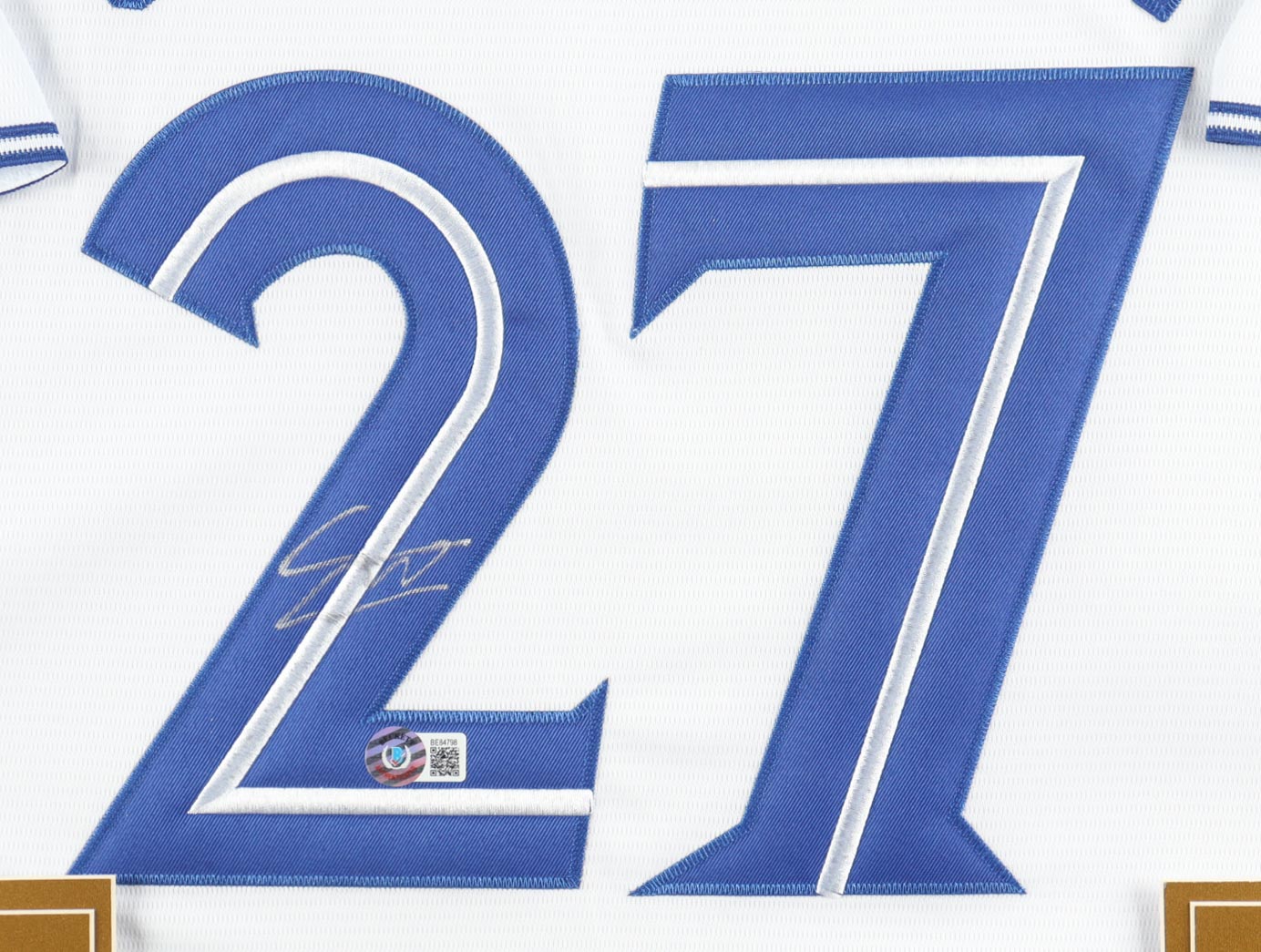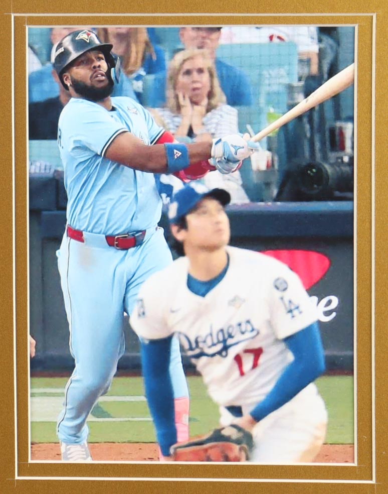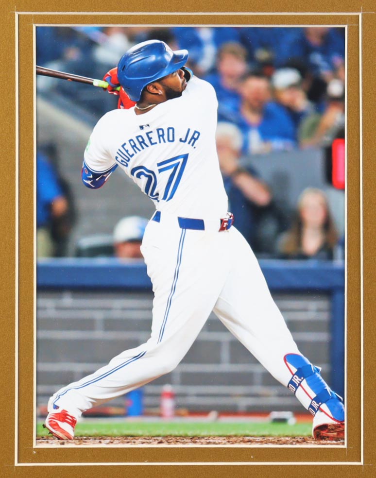 Custom frame measures 32" x 36" in size. Jersey has been hand-signed by Vladimir Guerrero Jr. Display also includes (2) photos, (2) cloth team logo patches, statistics plaque, and an Official 2025 American League Champions pin. Please refer to photos regarding the condition of the item.