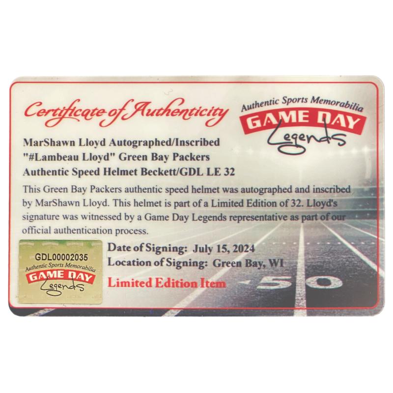 MarShawn Lloyd Signed LE Packers Full-Size Authentic On-Field Speed Helmet Inscribed "Lambeau Lloyd" (Beckett & GameDay Legends)
