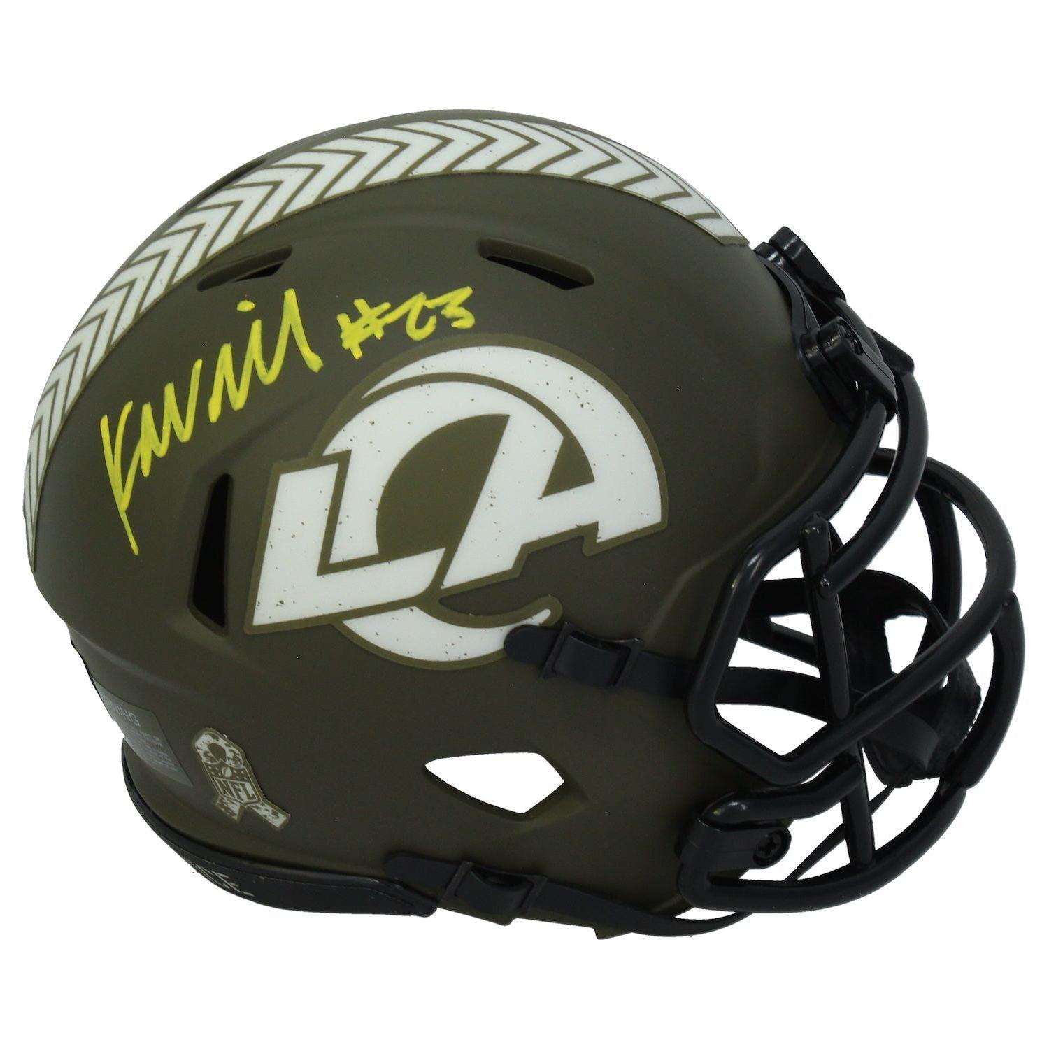 Riddell Los Angeles Rams salute to service alternate speed mini helmet has been hand-signed by Kyren Williams.