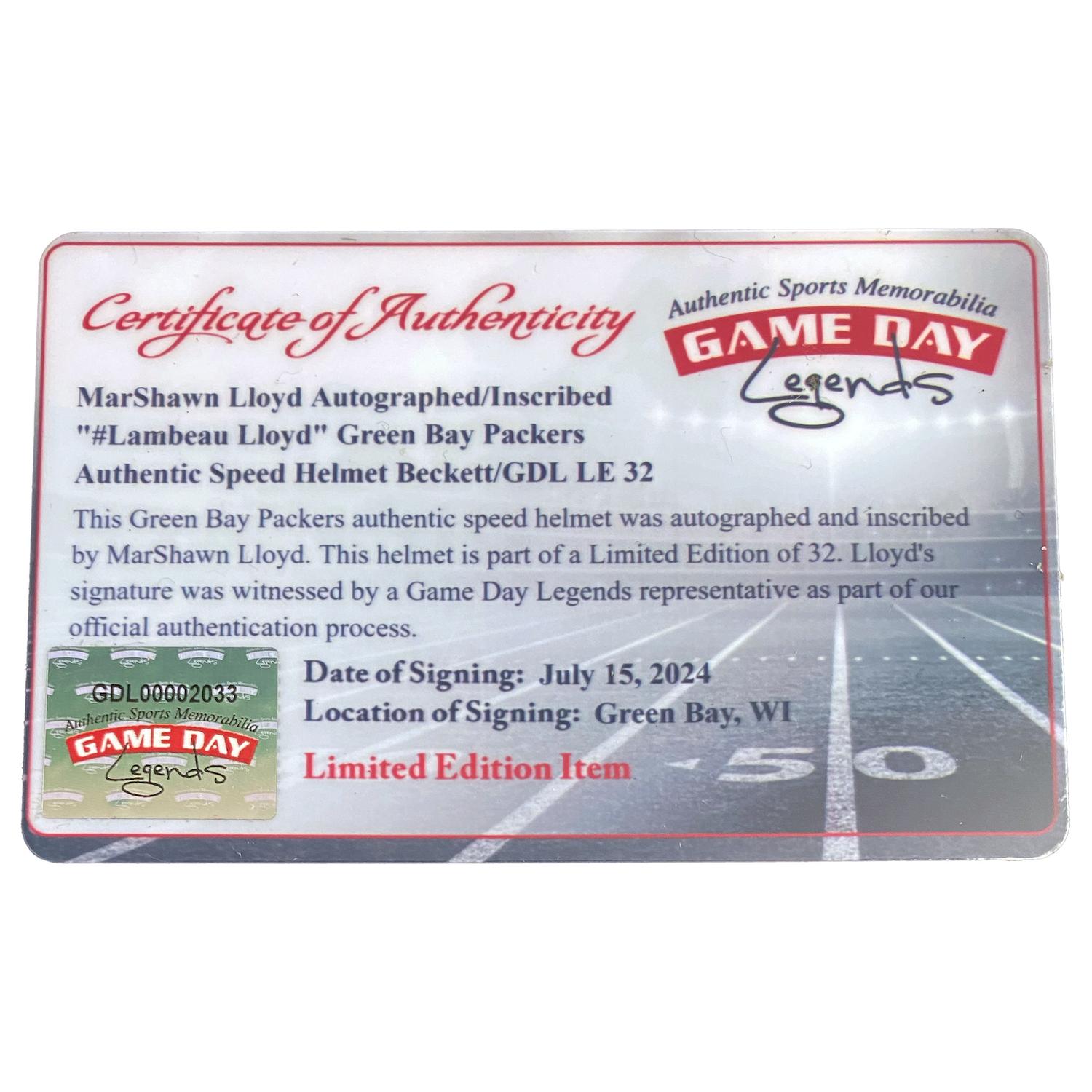 Riddell Green Bay Packers full-size authentic on-field speed helmet has been hand-signed and inscribed by MarShawn Lloyd. This item is limited edition and has been numbered #1/32.