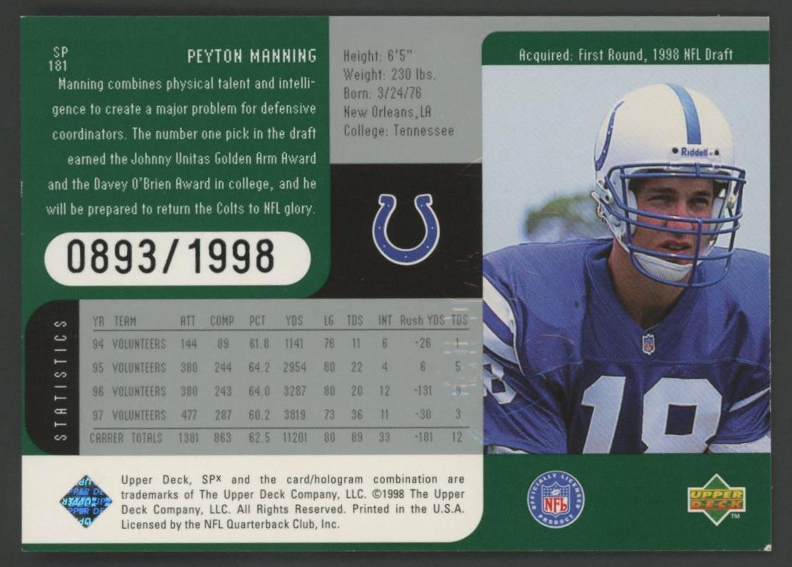Peyton Manning 1998 SPX Finite #SP181 #893/1998 RC