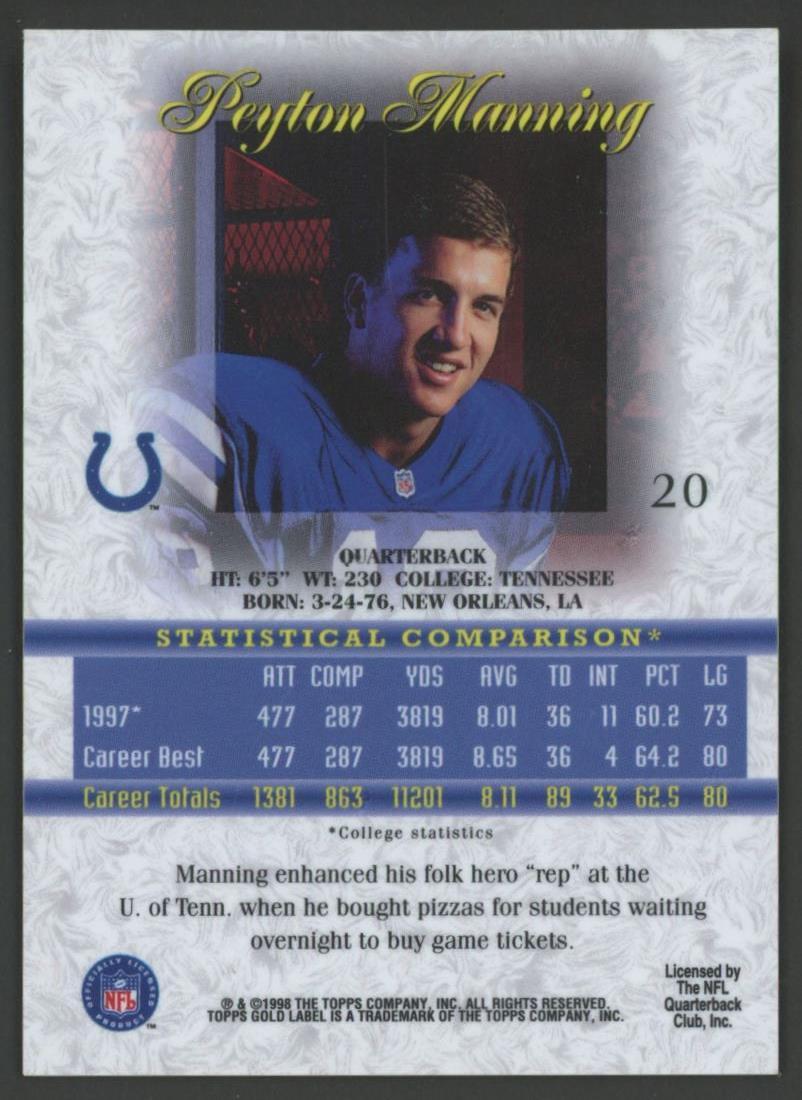 Peyton Manning 1998 Topps Gold Label Class 1 #20 RC