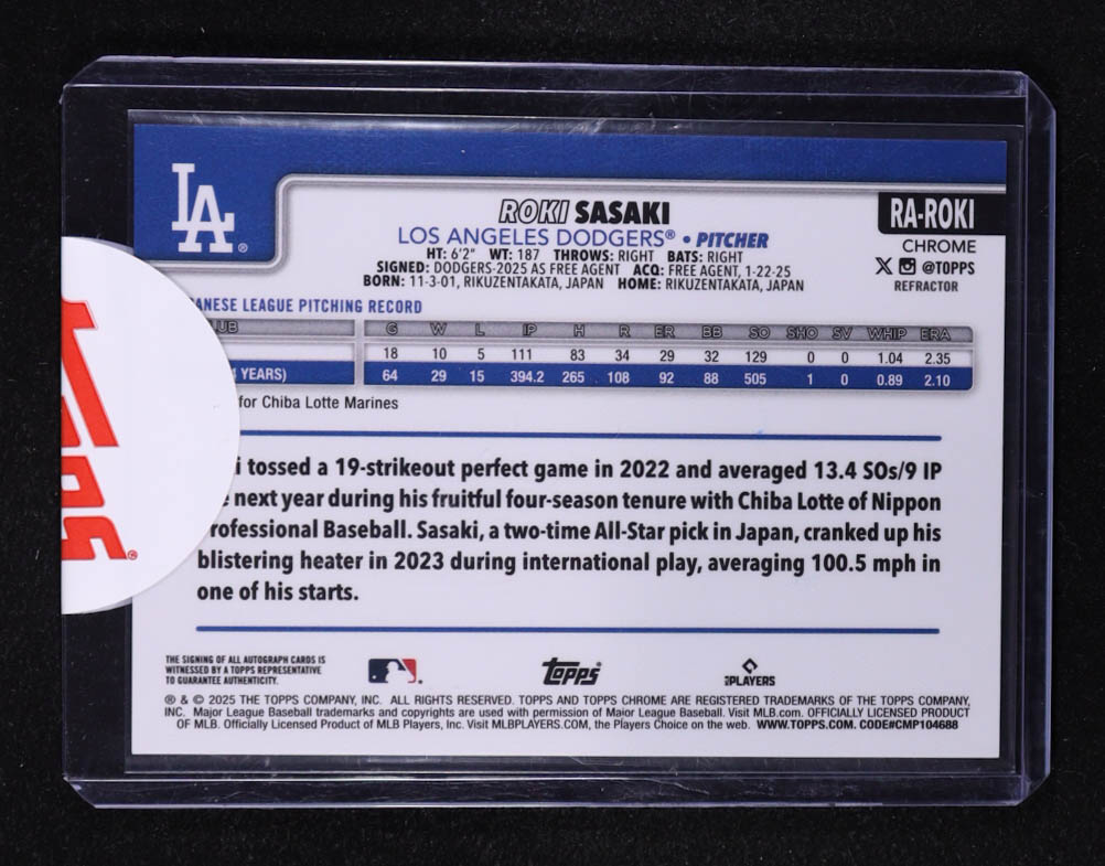 Roki Sasaki 2025 Topps Chrome Rookie Autographs Refractors #RAROKI #189/499 RC