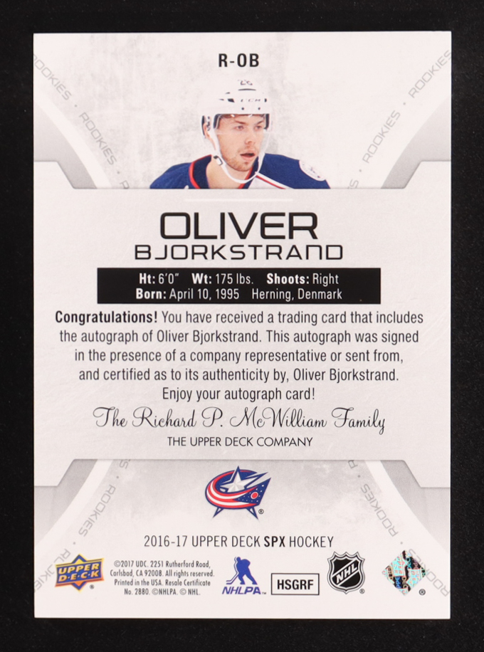 Oliver Bjorkstrand 2016-17 SPx Rookies Blue Autograph #ROB #060/165 RC