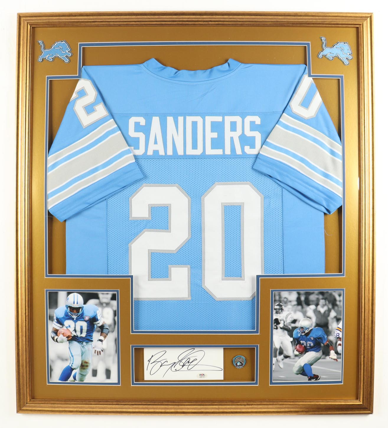 Barry Sanders Signed Custom Framed Cut Display with Jersey & Photos & HOF Induction Pin (PSA)