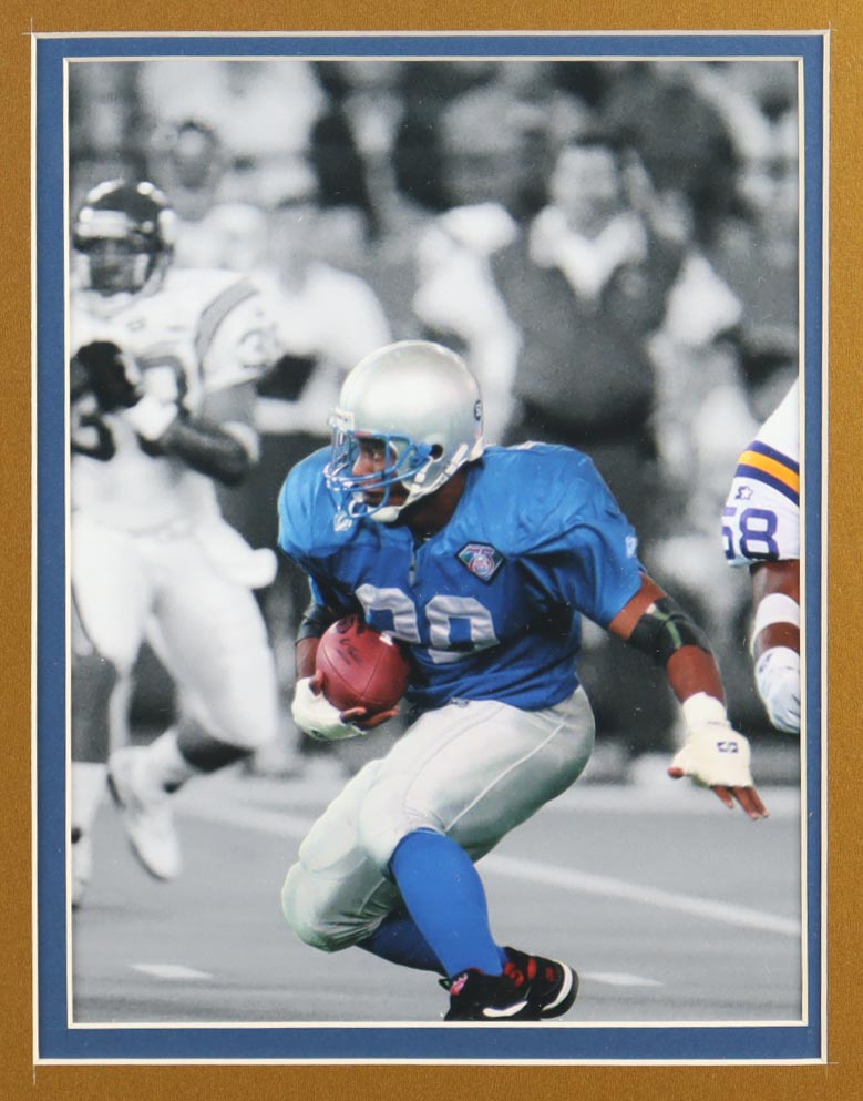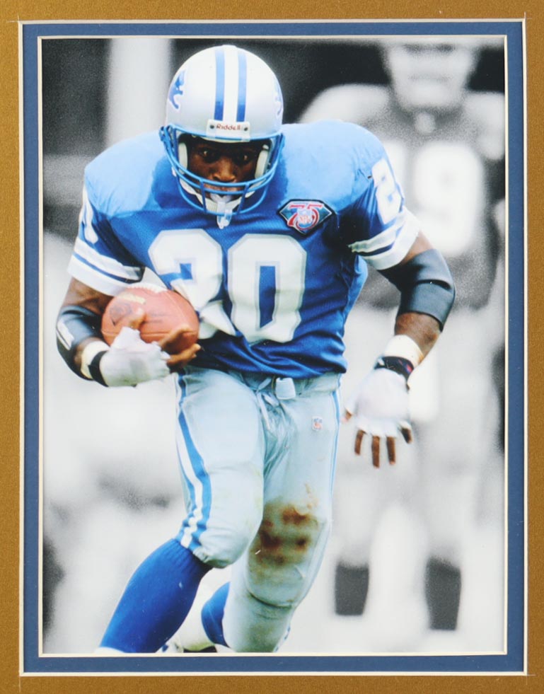 Custom framed display measures approximately 35" x 43" in size and features a cut that has been hand-signed by Barry Sanders (HOF). Display also features a jersey, (2) 8" x 10" photos, (2) Lions Logo patches and a Hall of Fame Induction pin. Please see photos for more details regarding the condition of the item.