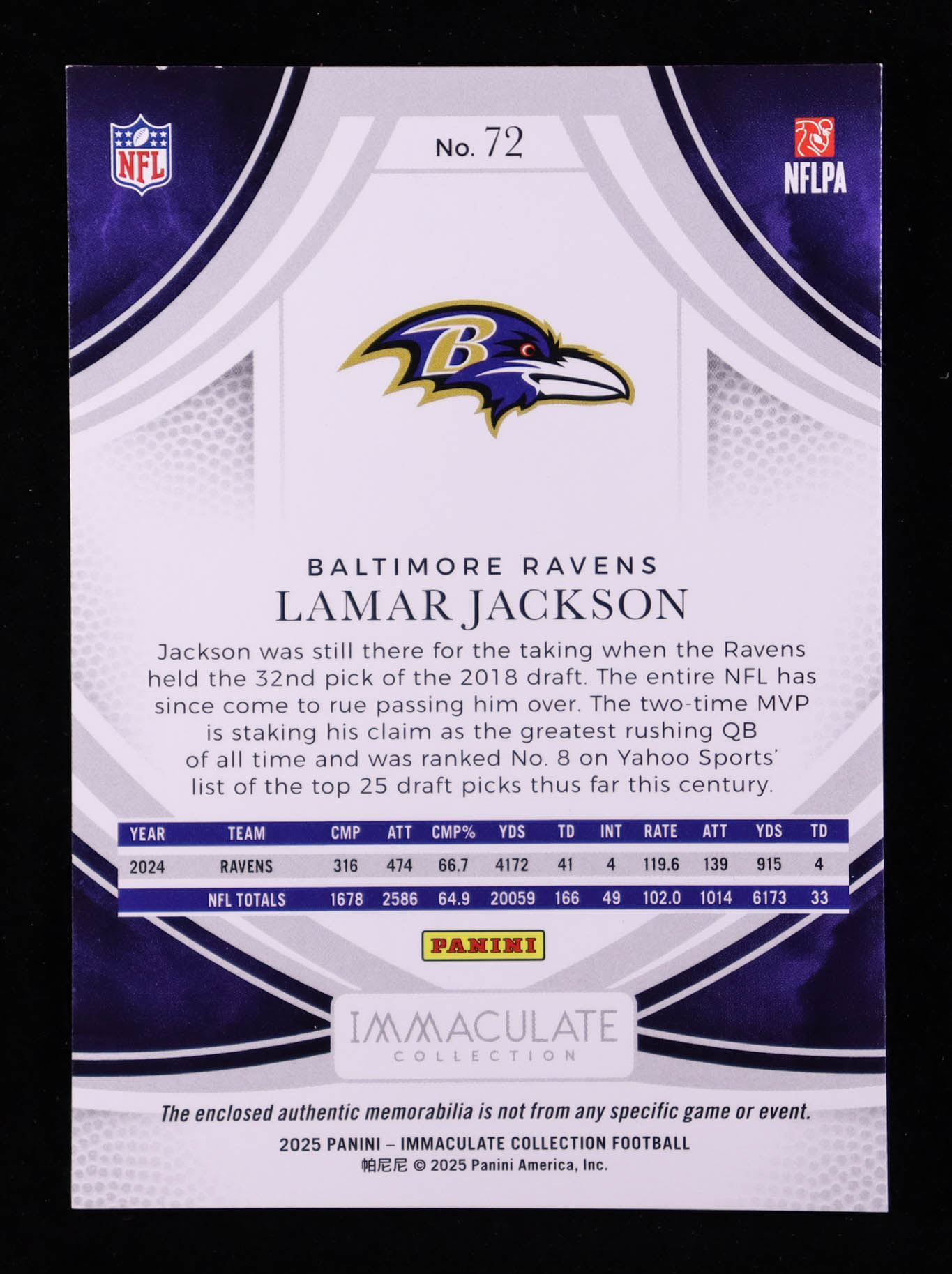 Lamar Jackson 2025 Immaculate Collection #72 JSY #56/99