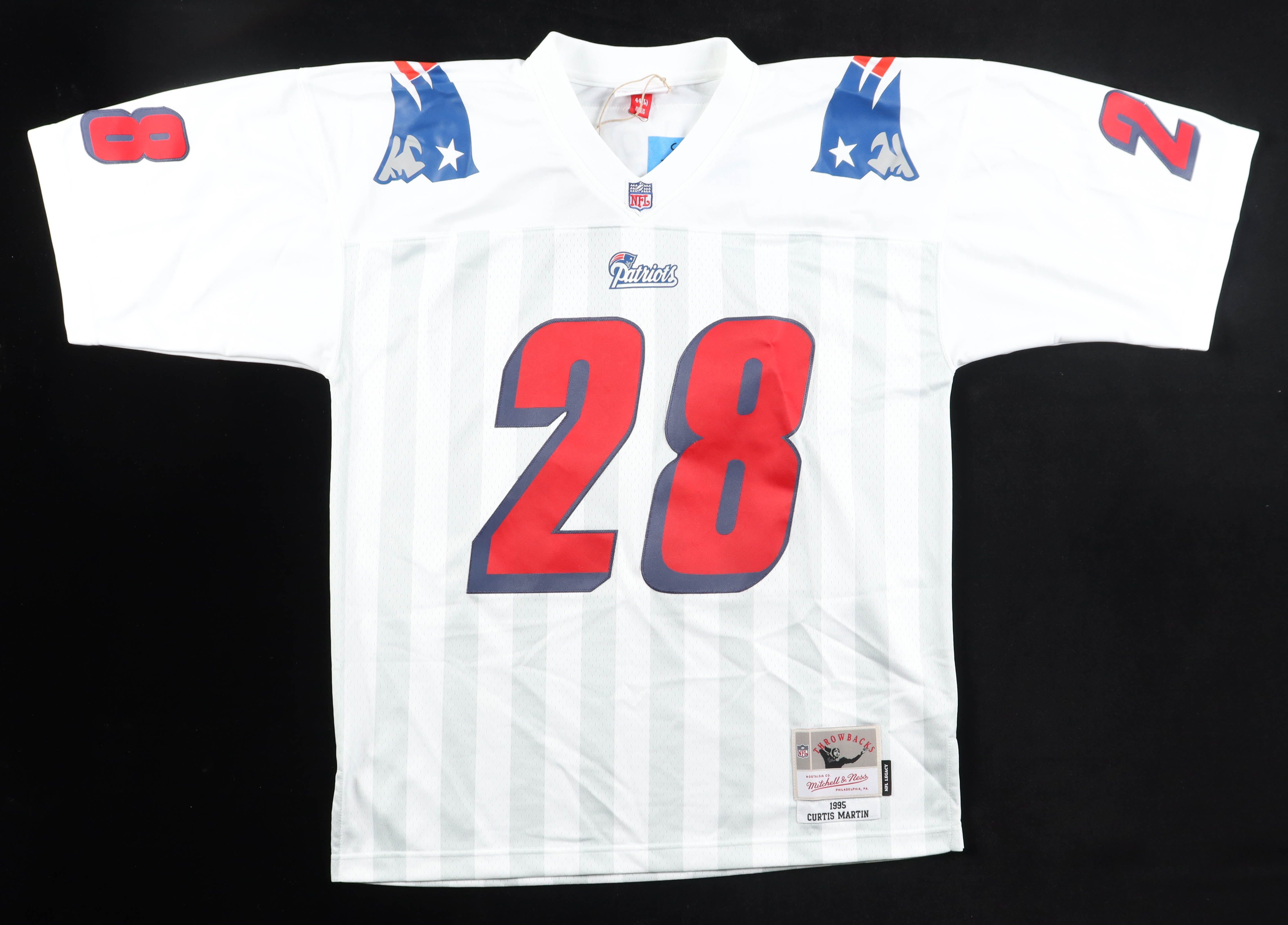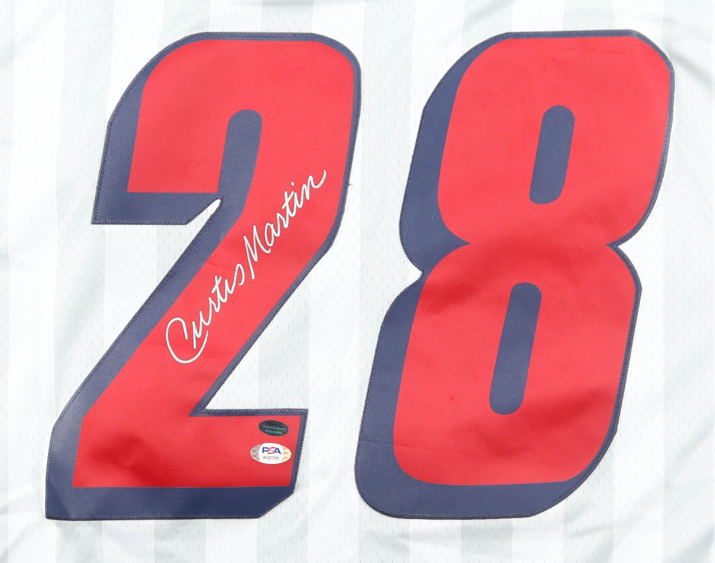 Mitchell & Ness authentic jersey with everything sewn on, size L (44). Hand-signed by Curtis Martin.