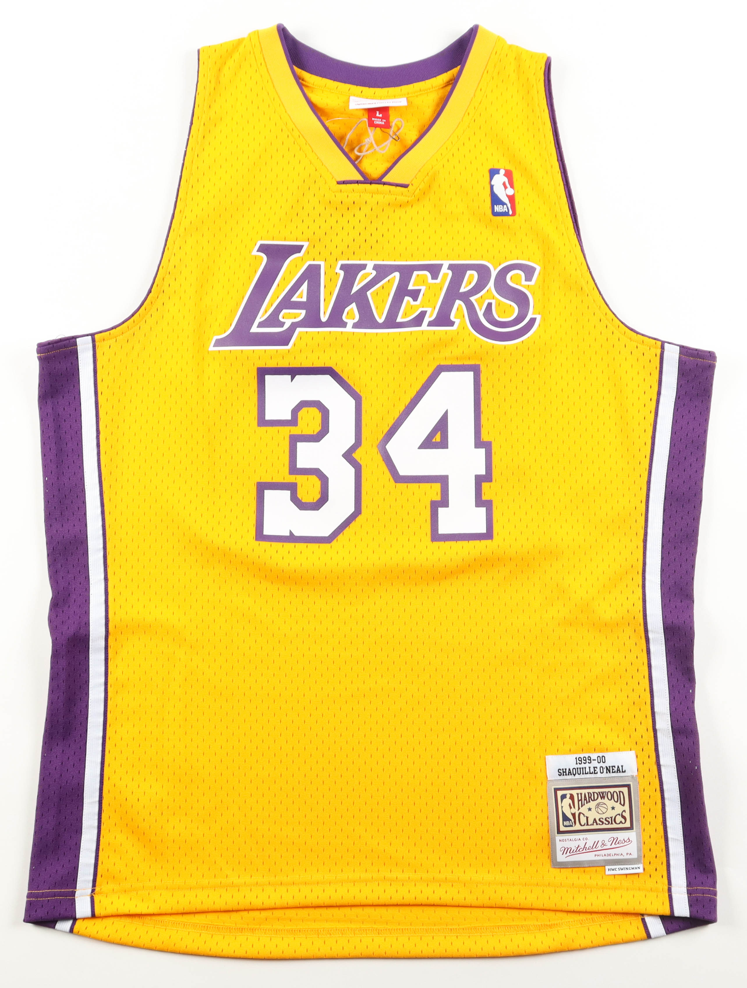 Mitchell & Ness authentic jersey with everything pressed on, size L. Hand-signed by Shaquille O'Neal (Los Angeles Lakers, HOF).
