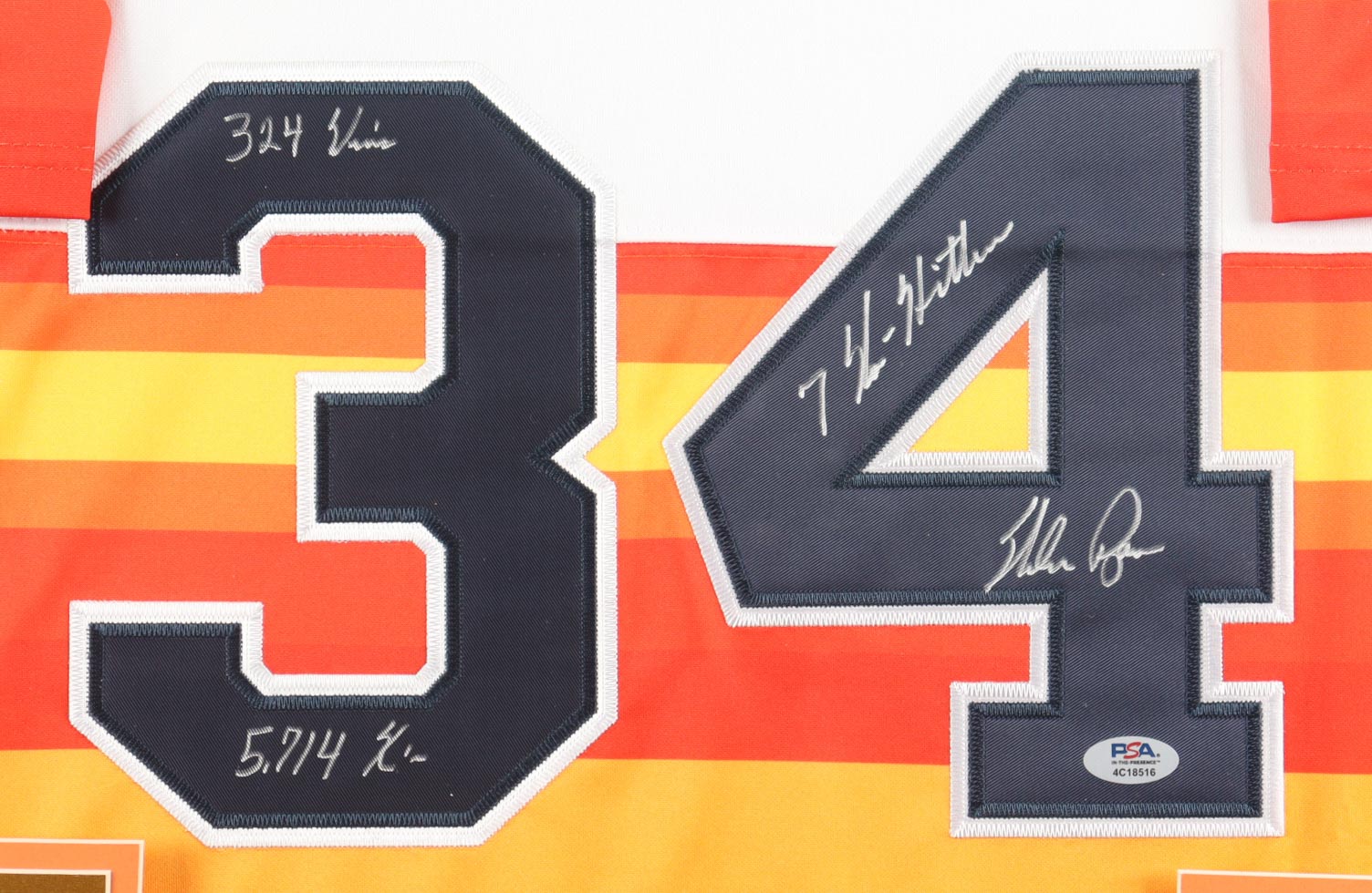 Nolan Ryan Signed Custom Framed Jersey Display Inscribed "7 No-Hitters" & "324 Wins" & "5,714 K's" with HOF Pin (PSA)