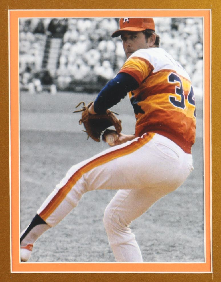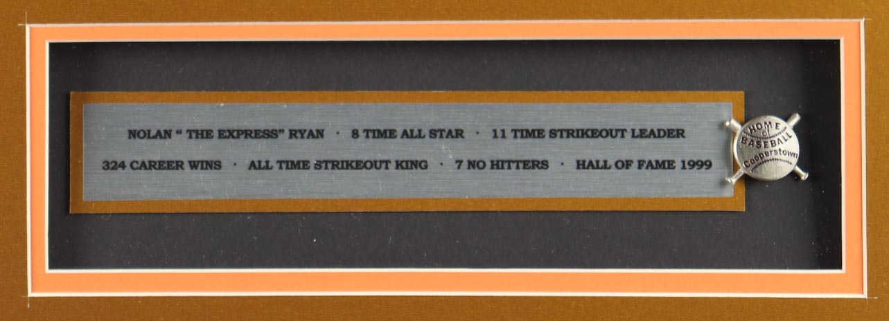 Custom frame display measures approximately 32" x 36" in size and features a jersey that has been hand-signed and inscribed by Nolan Ryan (HOF). The display also includes a Hall of Fame pin, (2) 8" x 10" photos and (2) cloth team logo patches and a career statistics plaque. Please see photos for more details regarding the condition of the item.