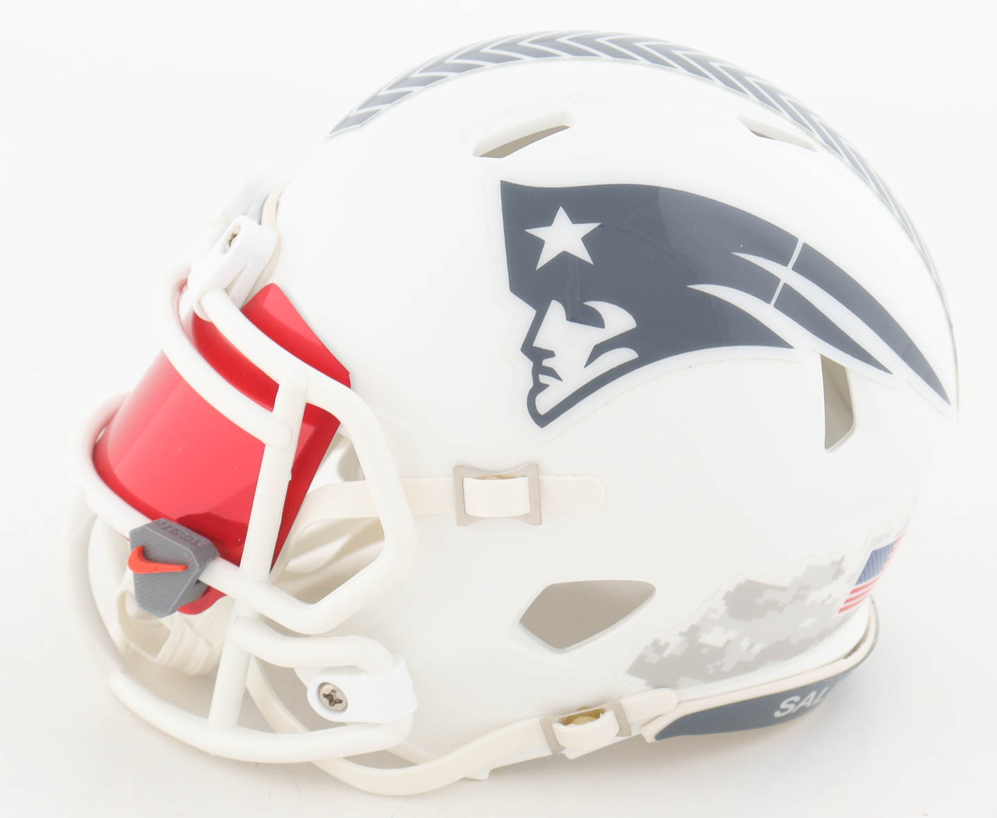 Riddell New England Patriots Salute to Service alternate Speed mini helmet. Hand-signed by TreVeyon Henderson.