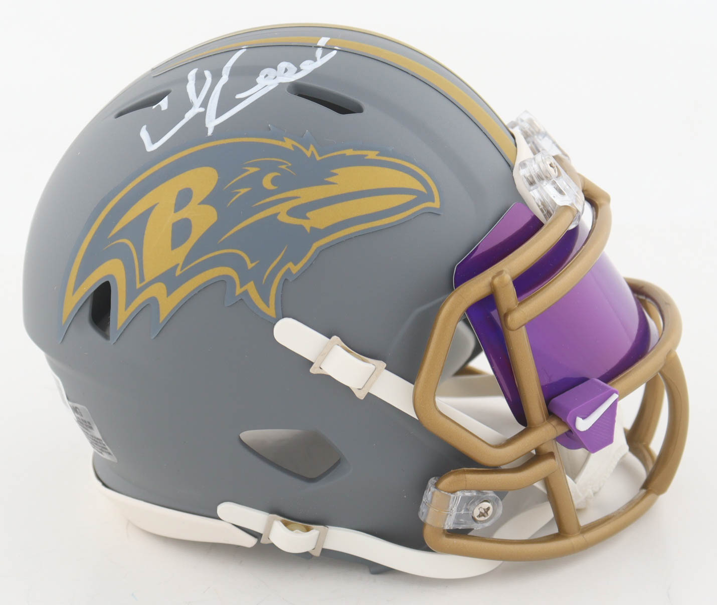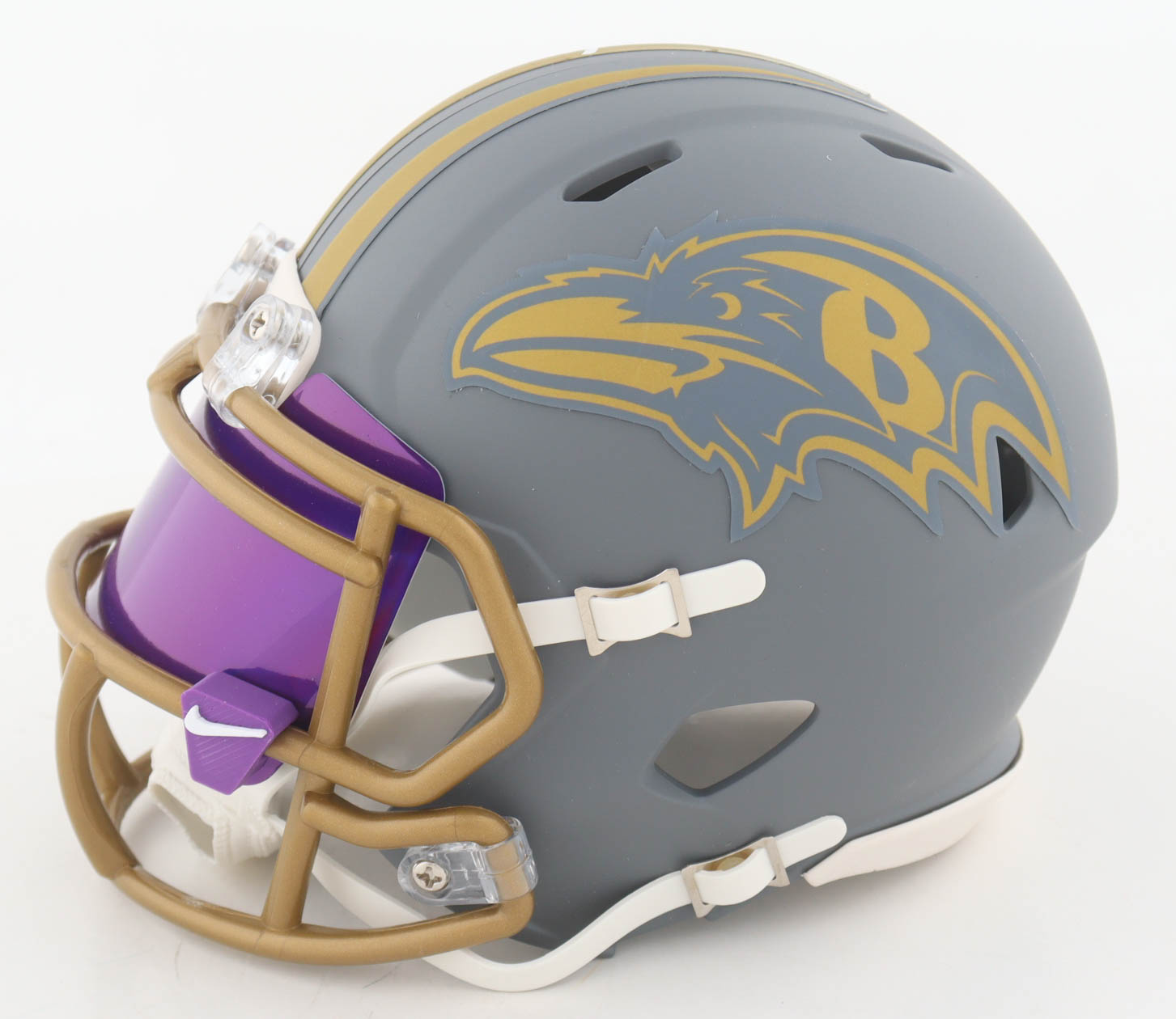 Riddell Baltimore Ravens slate alternate speed mini helmet with visor. Hand-signed by Ed Reed (HOF).