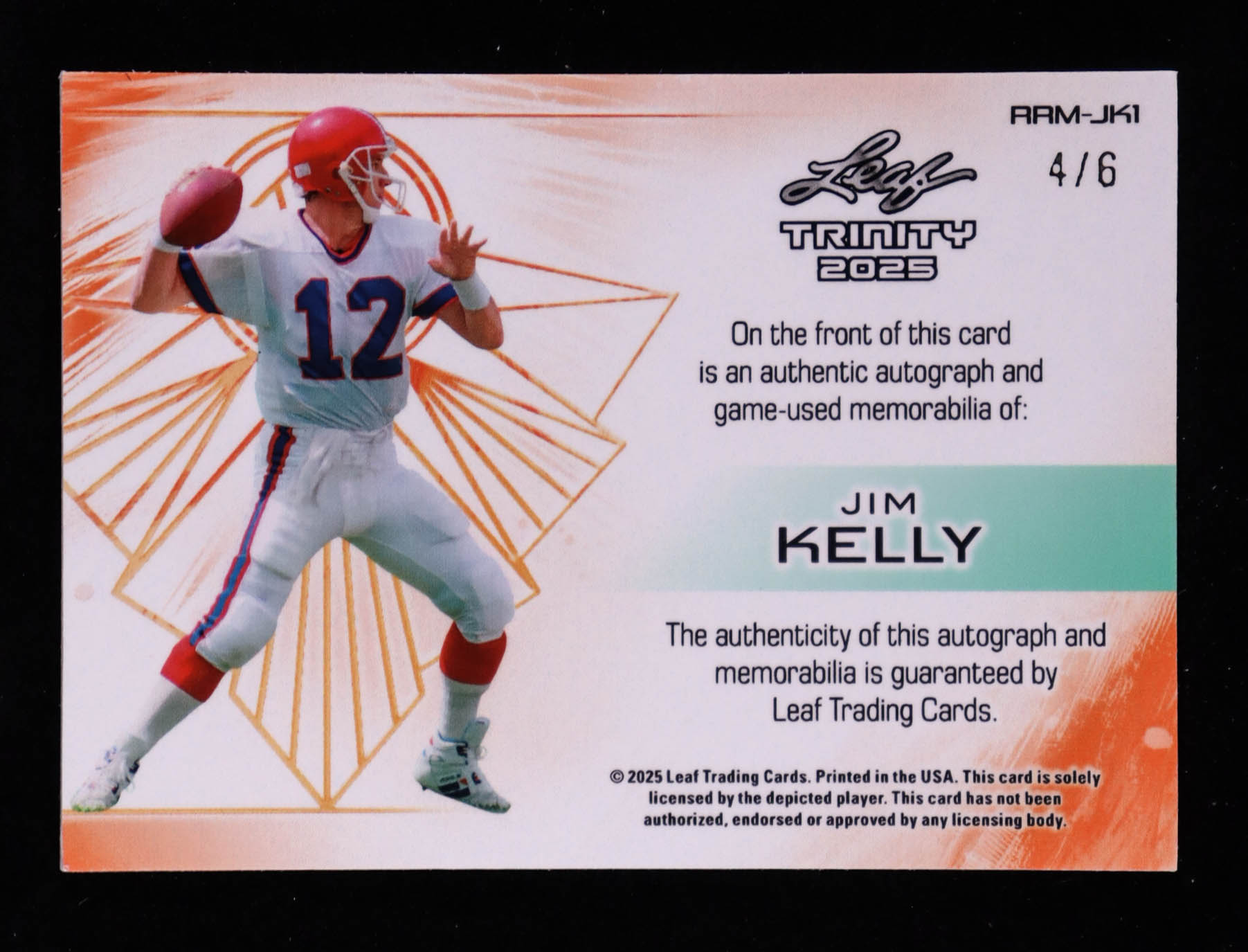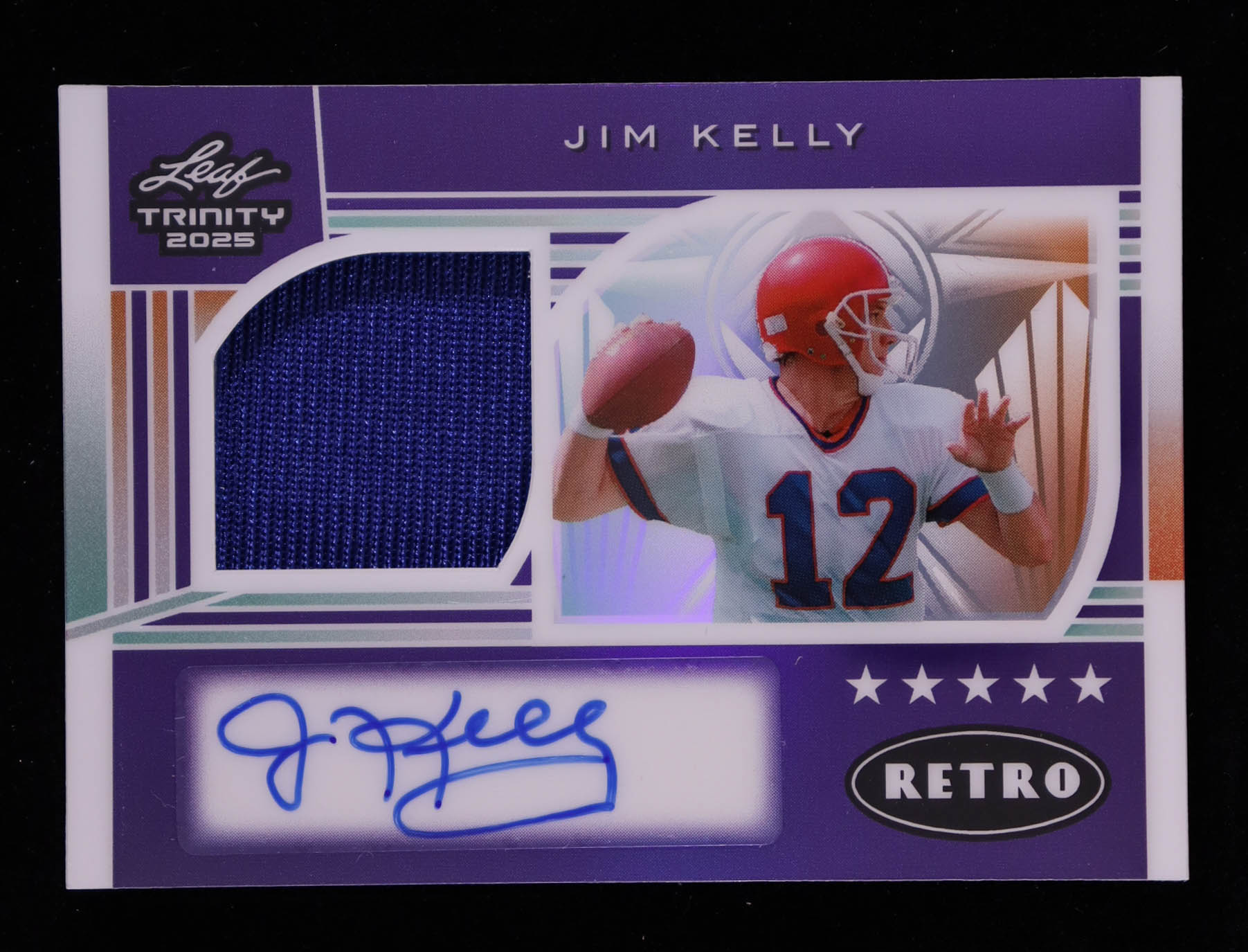 Jim Kelly 2025 Leaf Trinity Retro Rookie Memorabilia Autographs Metal Prismatic Purple #RRMJK1 #4/6