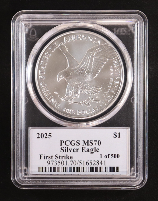 2025 American Silver Eagle, First Strike - Thomas S. Cleveland Signature Label #1/500 (PCGS MS70)