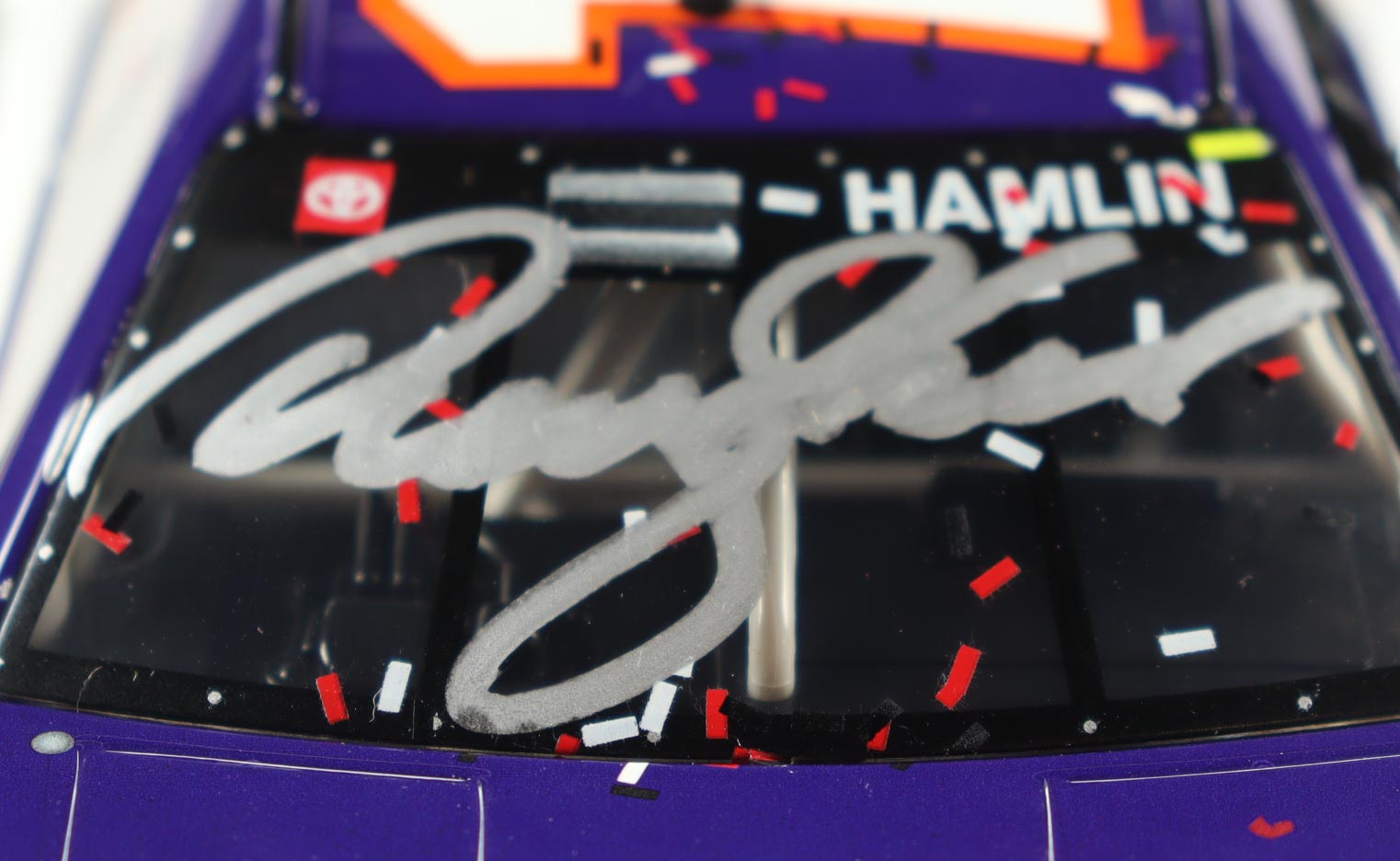 NASCAR die-cast car has been hand-signed on the windshield by Denny Hamlin.