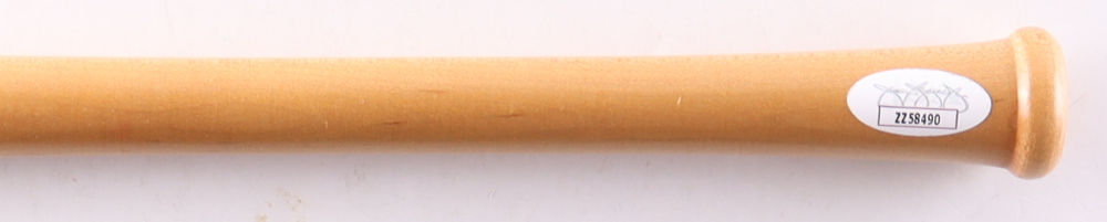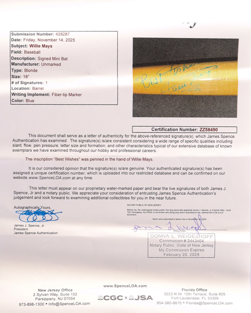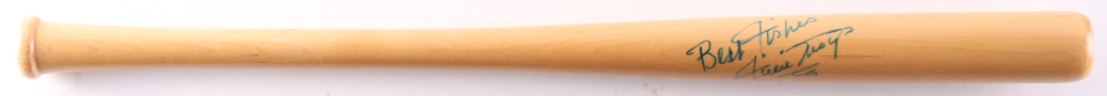 Mini baseball bat has been hand-signed and inscribed by Willie Mays (d. 2024, San Francisco Giants, HOF).