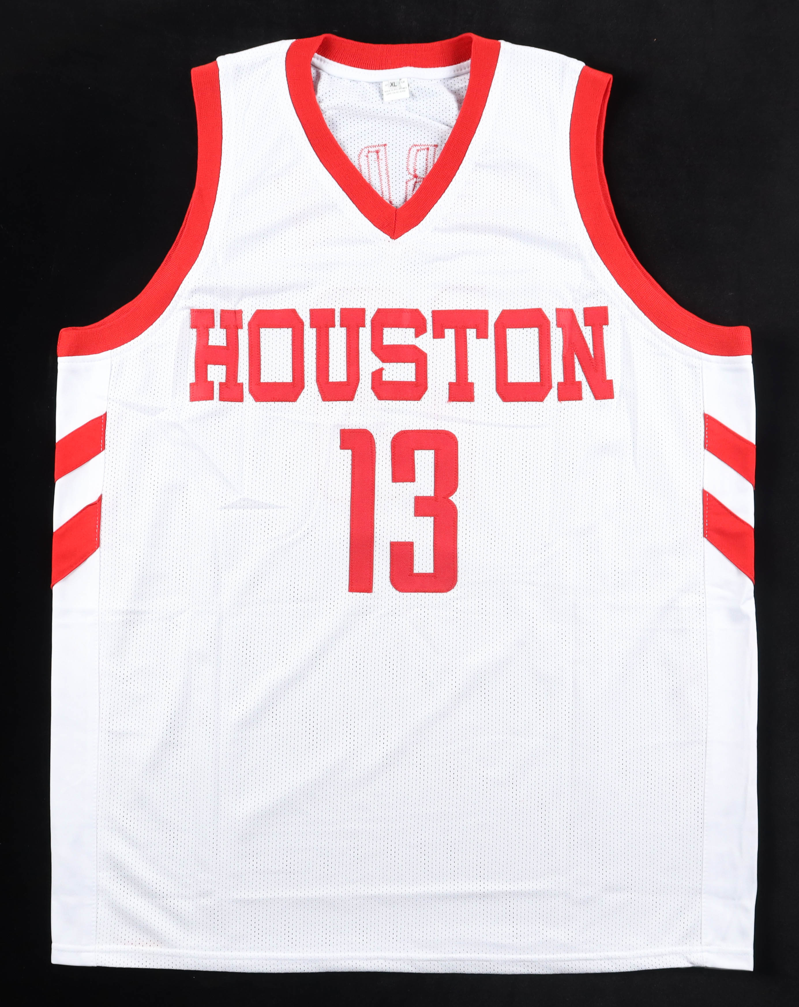 Custom jersey with everything sewn on, size XL. Hand-signed by James Harden.