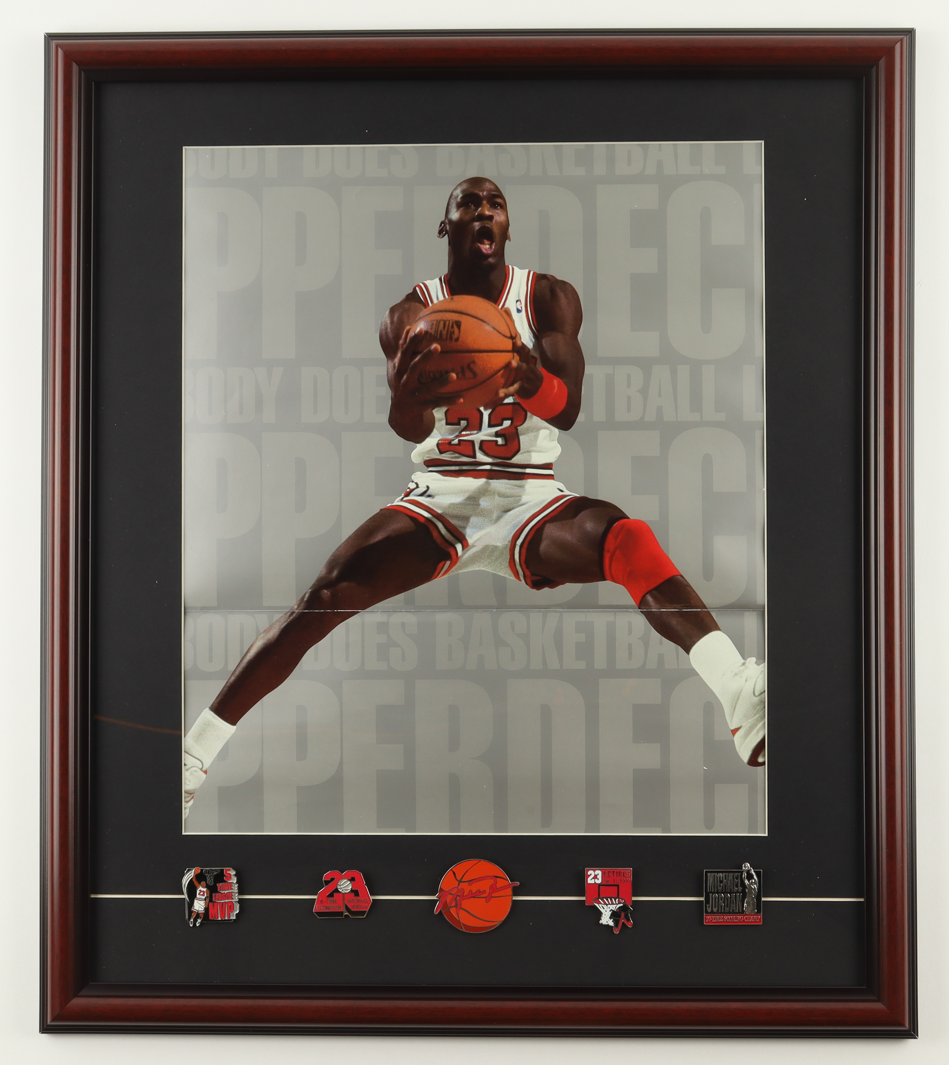 Michael Jordan Bulls Custom Framed Upper Deck In-Store Poster Display with (5) Vintage Jordan Pins