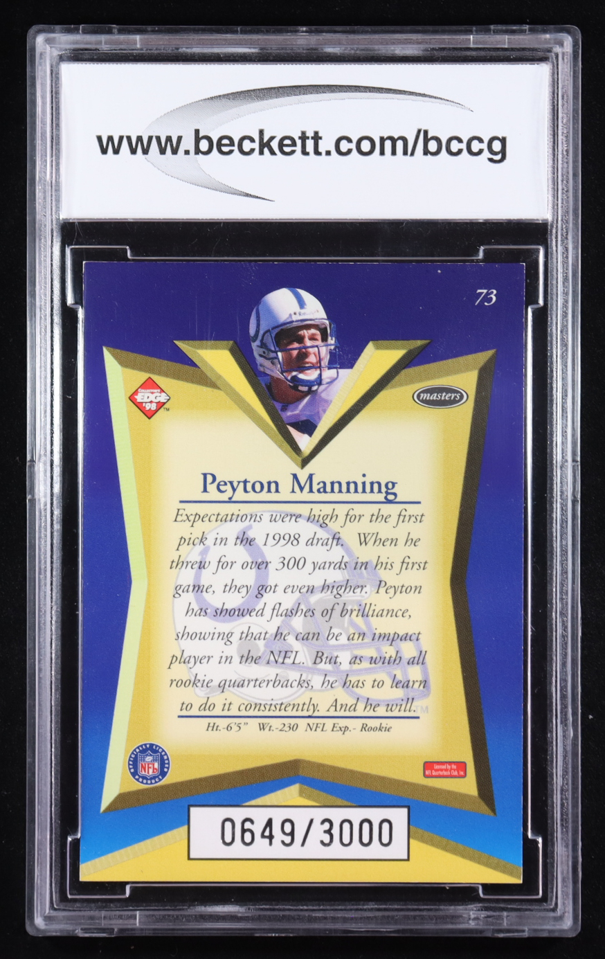 Peyton Manning 1998 Collector's Edge Masters 50-point #73 #0649/3000 RC (BCCG 10)