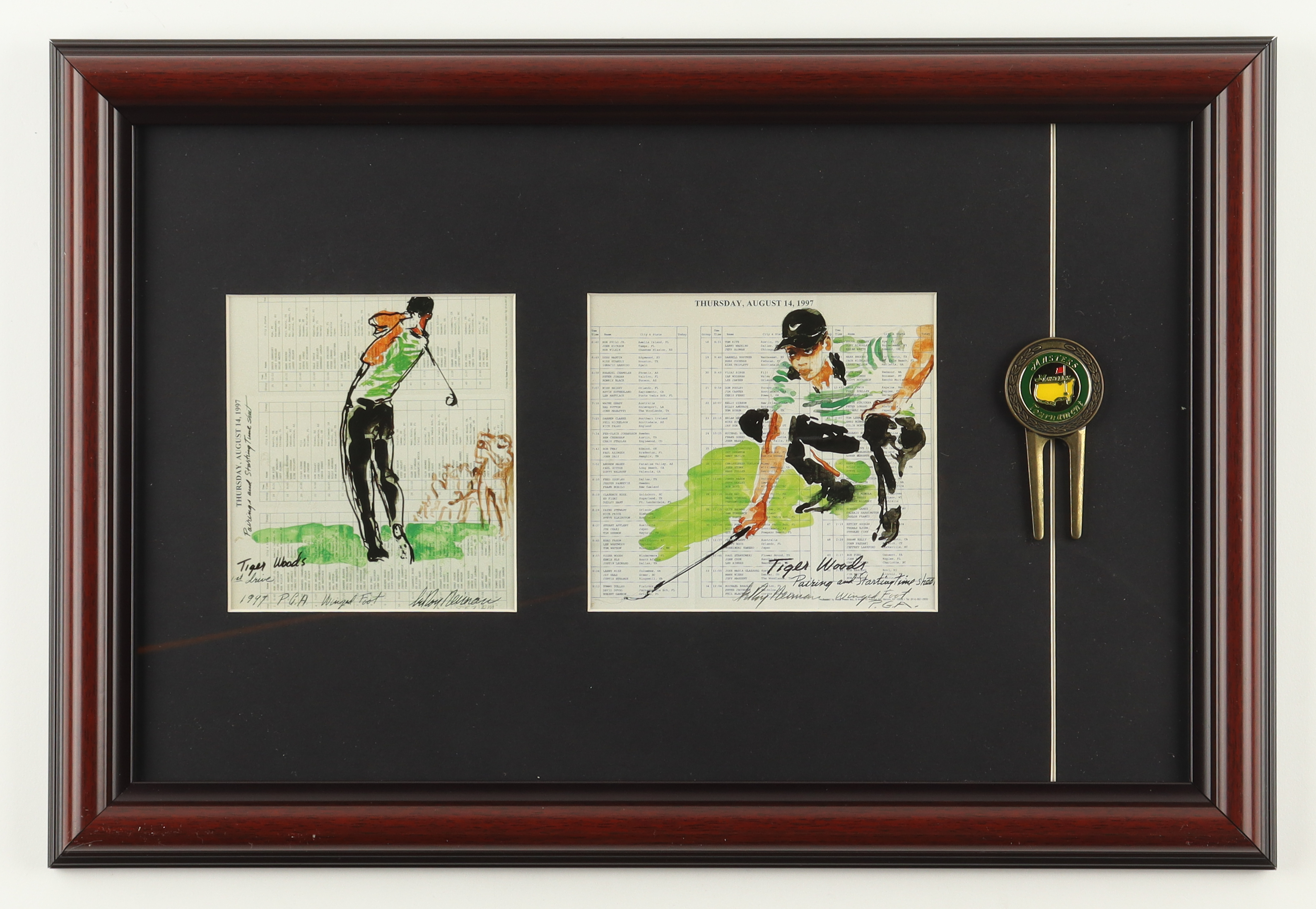 Tiger Woods LeRoy Neiman "Tiger Woods on Two Scorecards" Custom Framed Print Display with Masters Divot Repair Tool