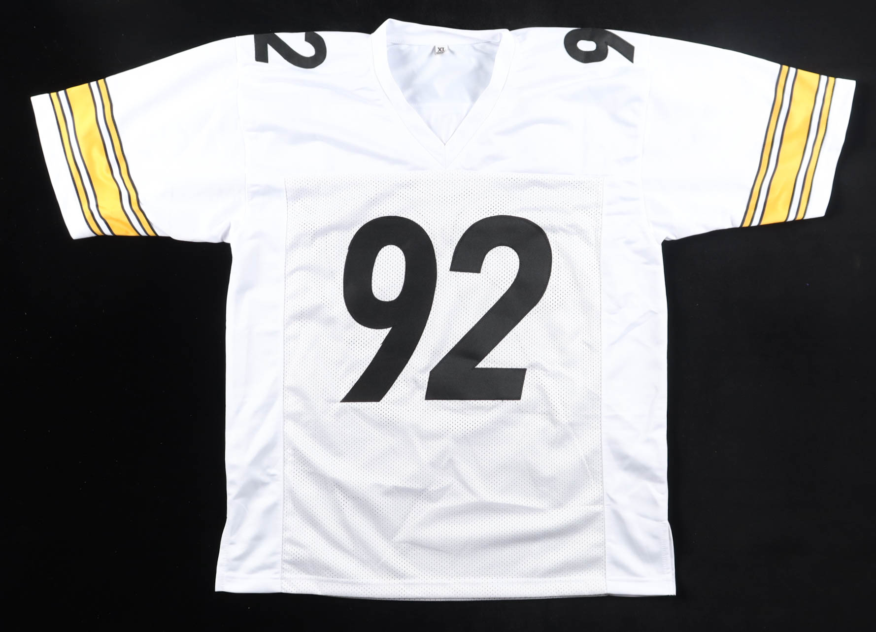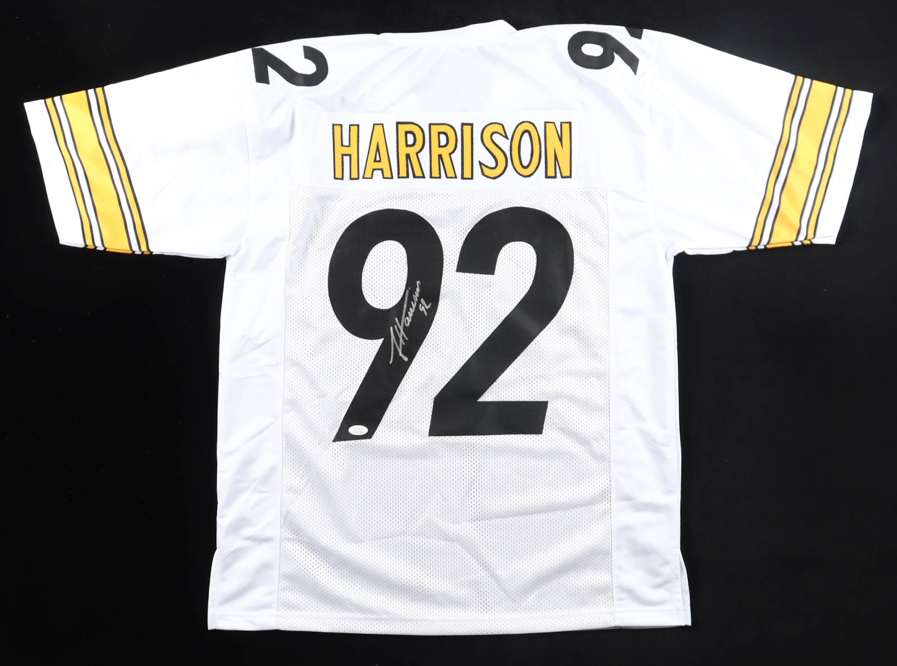 Custom jersey with everything sewn on, size XL. Hand-signed by James Harrison.