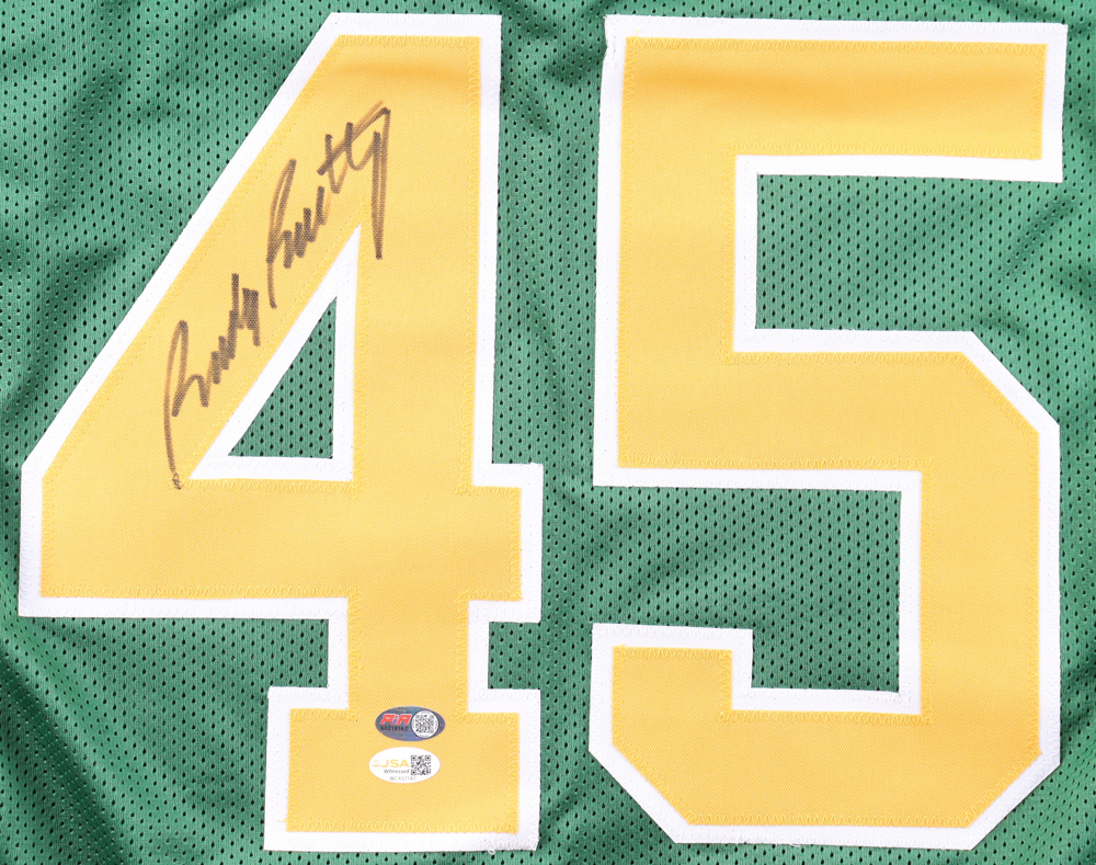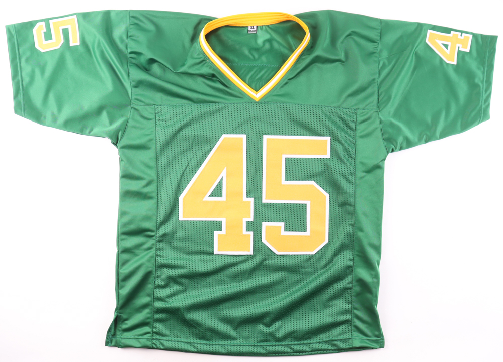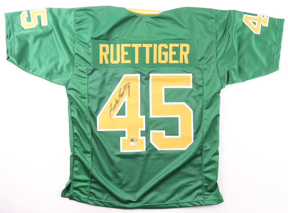 Custom jersey with everything sewn on, size XL. Hand-signed by Rudy Ruettiger.