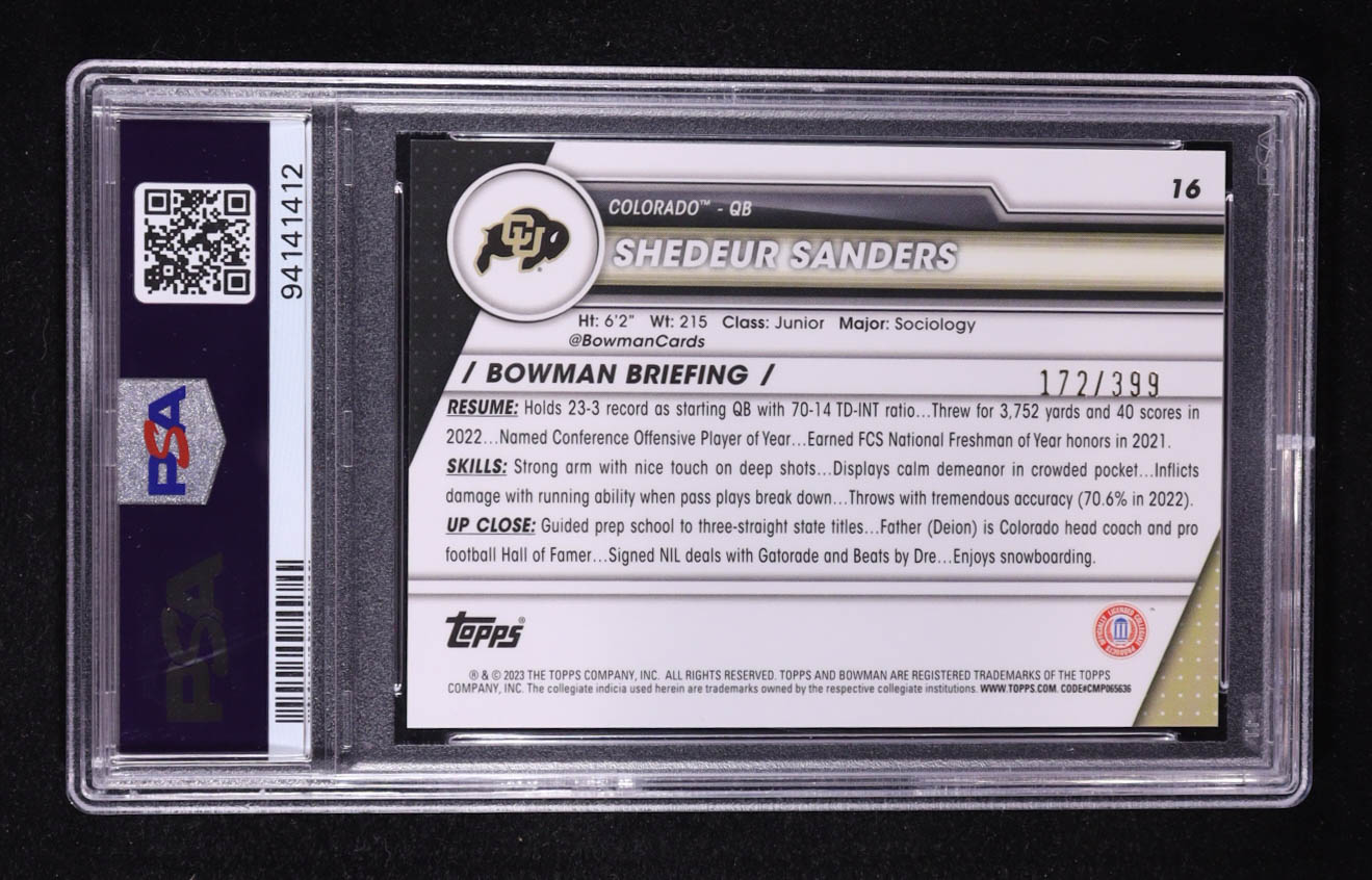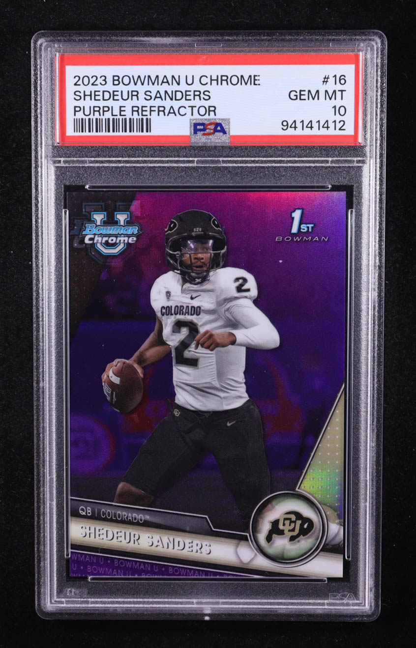 Shedeur Sanders 2023 Bowman Chrome University Purple Refractors #16 RC #172/399 (PSA 10)
