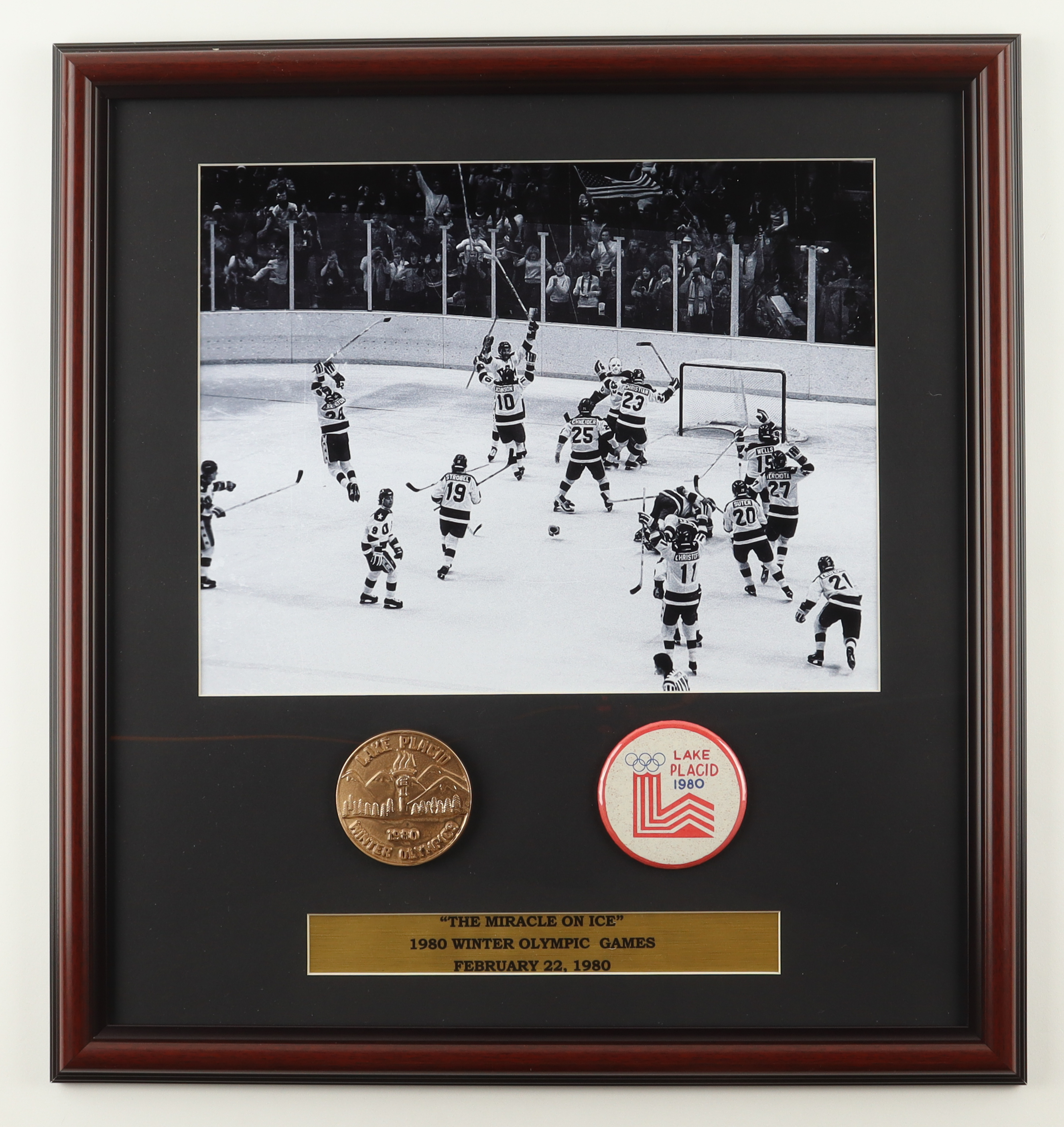 Custom frame measures 20" x 22" in size featuring an 11" x 14" photo. Please see photos for details regarding the item. Display also includes a brass Olympic Emblem as well as a 1980 Lake Placid lapel pin. Note that the item is unsigned.