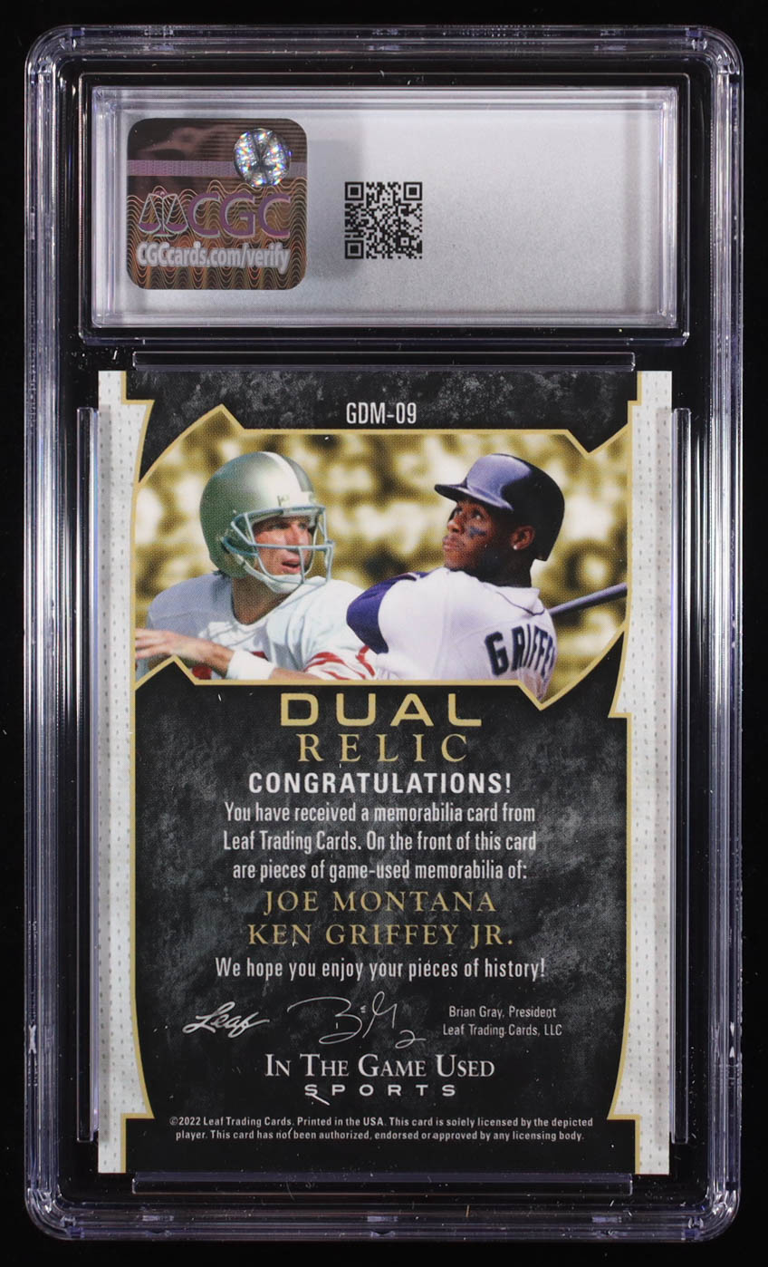 Joe Montana / Ken Griffey Jr. 2022 ITG Used Sports Game Used Dual Memorabilia Platinum Blue Spectrum #GUDM09 #1/5 (CGC 9.5)