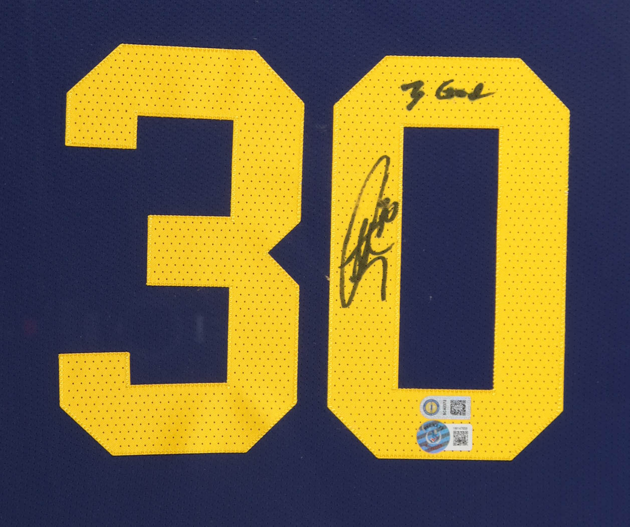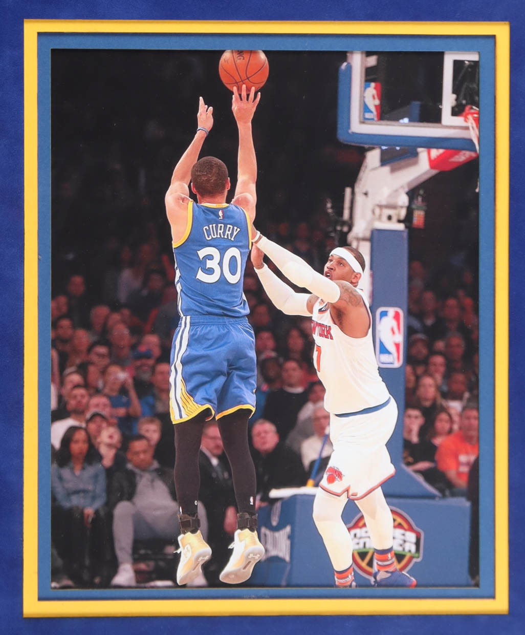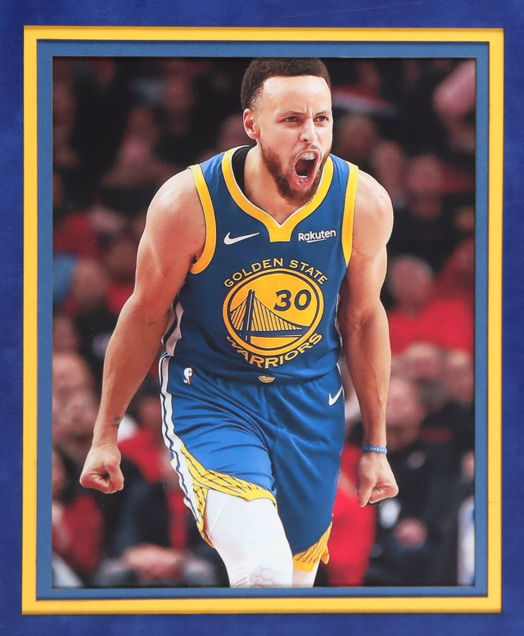 Custom frame measures 33" x 41" in size and features a jersey that has been hand-signed by Stephen Curry. Display also includes (2) 8" x 10" photos, and (2) (PSA) graded sports cards. Please see photos for more details regarding the condition of the item. Description of the (2) cards is listed below.