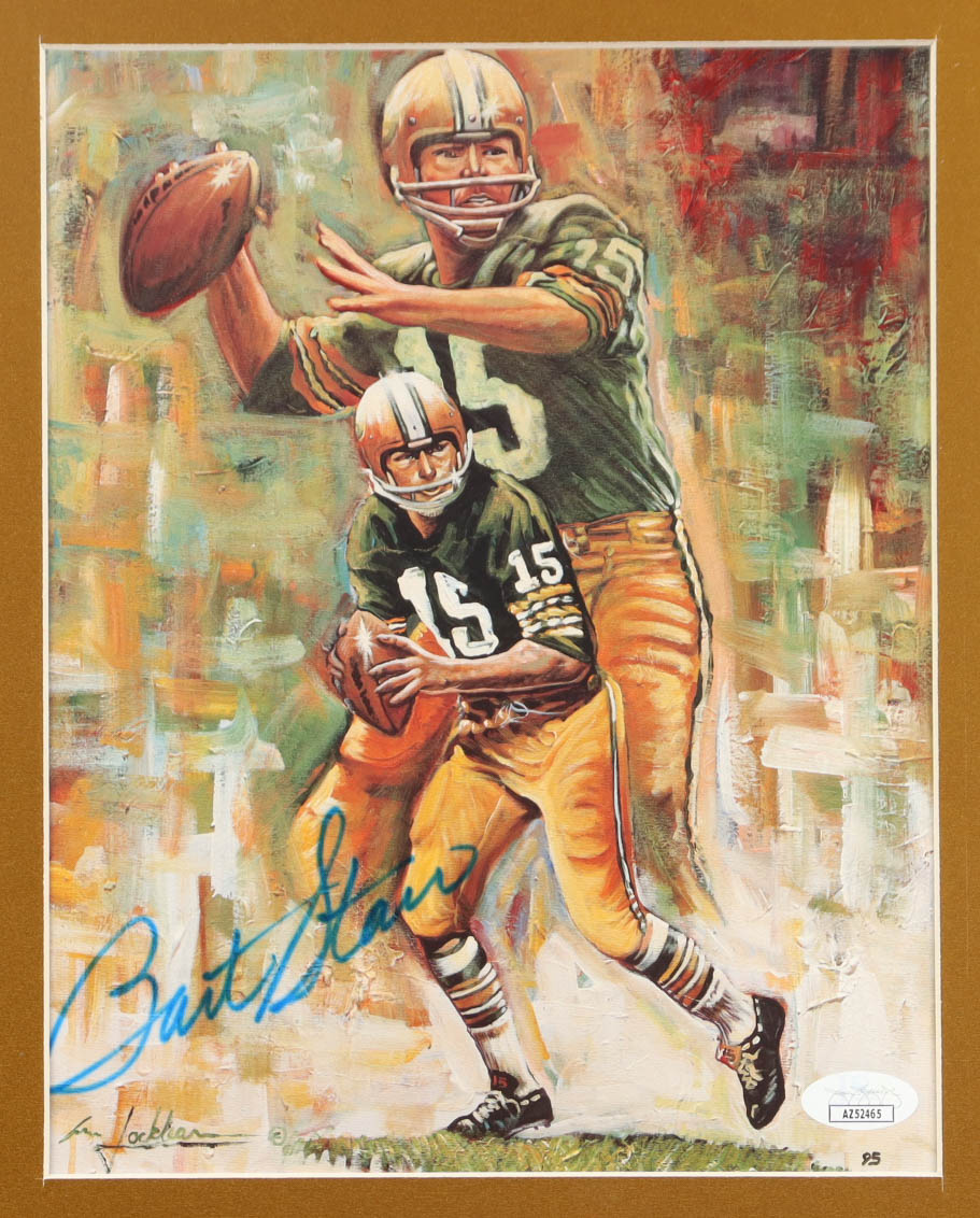 Frame measures approximately 16" x 16" in size. Featuring an 8" x 10" art print that has been hand-signed and inscribed by Bart Starr (D. 2019, Green Bay Packers, HOF). Display also includes a Green Bay Packers lapel pin with ribbon. Please see photos for details regarding the condition of the item.