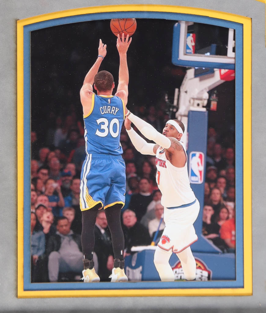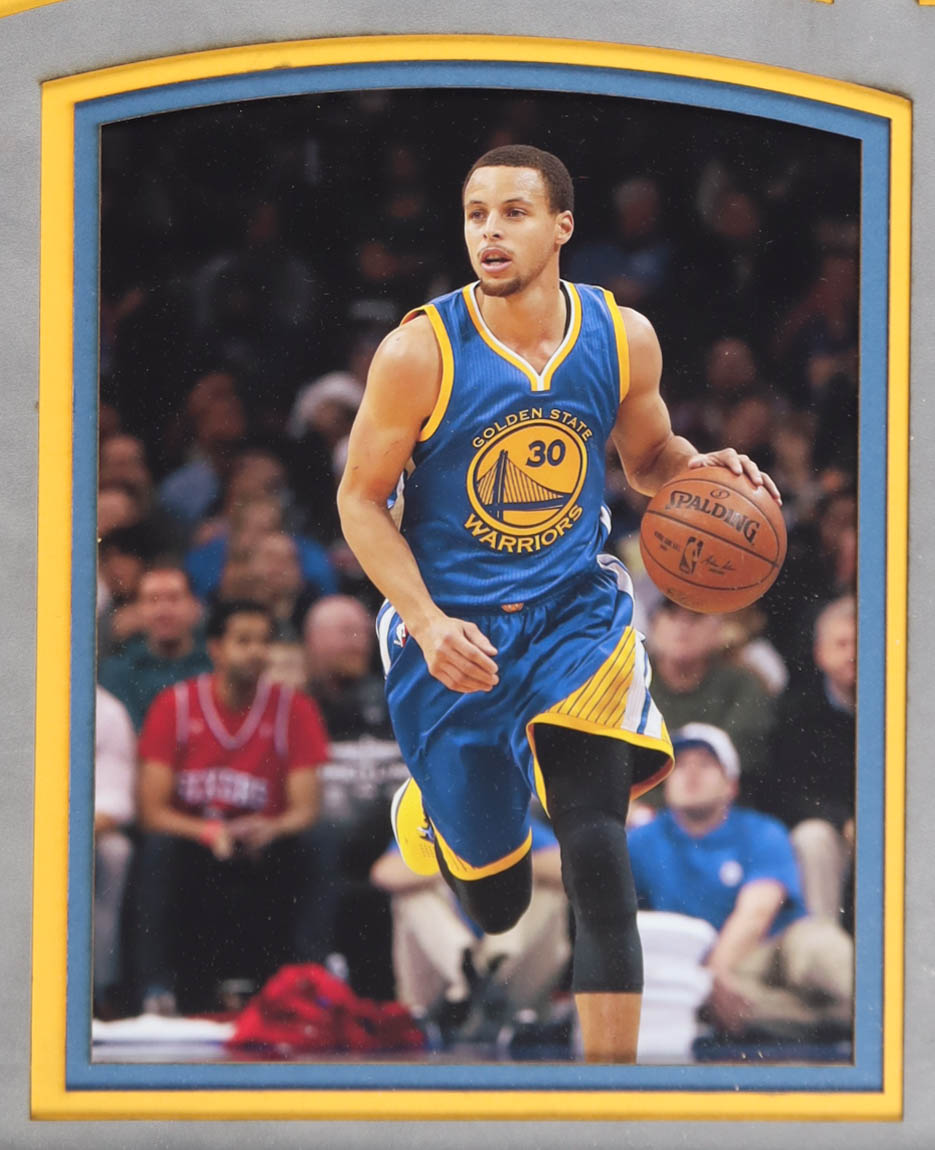 Custom frame measures 33" x 41" in size and features a jersey that has been hand-signed by Stephen Curry. Display also includes (2) 8" x 10" photos. Please see photos for more details regarding the condition of the item. Description of the (2) cards is listed below.