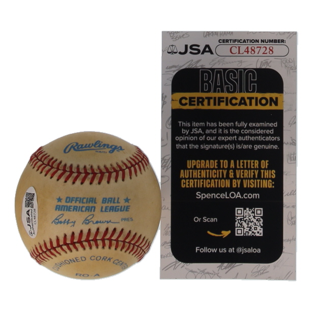 Rawlings Official American League Baseball. Hand-signed by Yogi Berra (D. 2015, New York Yankees, HOF). Please note, the baseball is naturally toned and stained throughout.