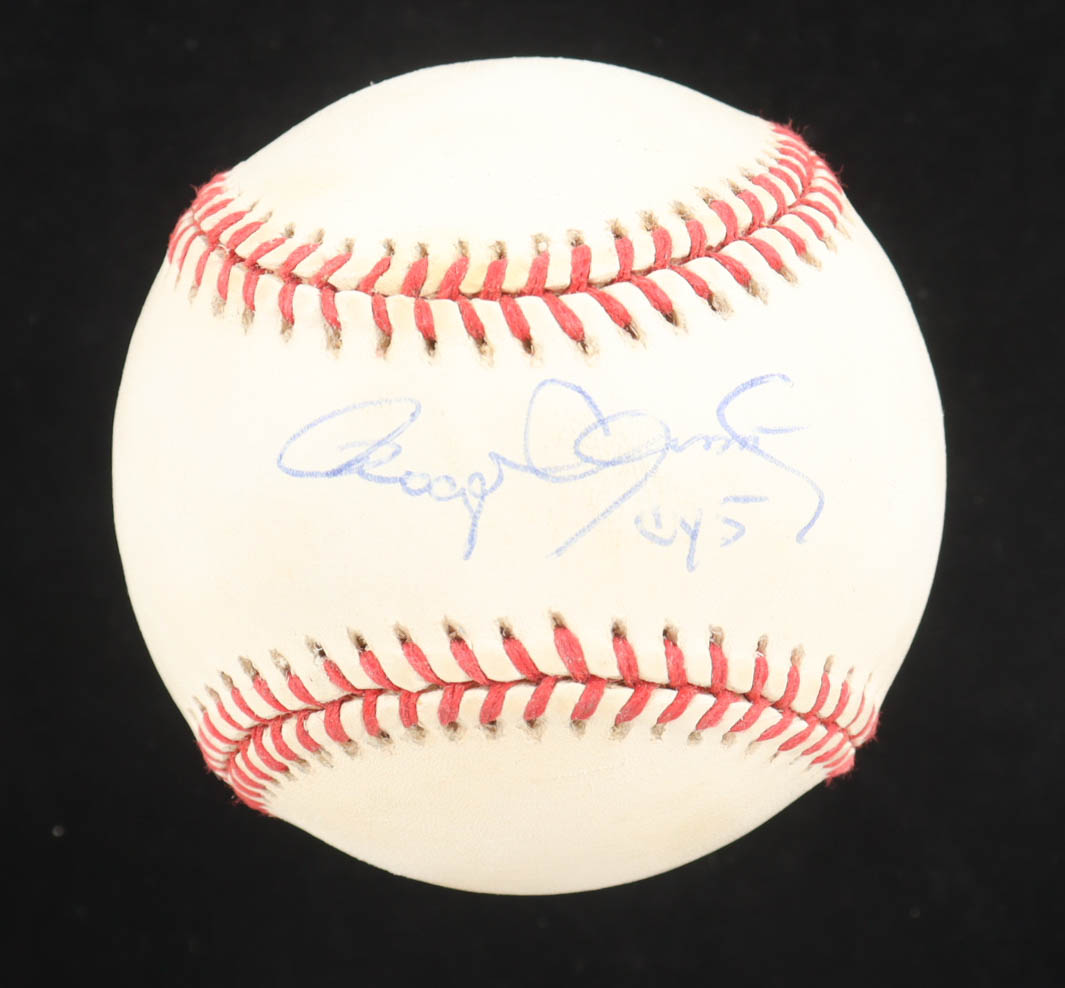 Roger Clemens Signed OAL Baseball with Display Case with Fenway Park Pin Inscribed "Cy 5" (Mays & PSA)