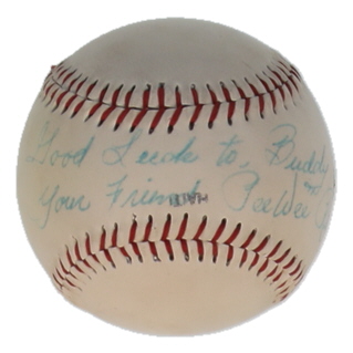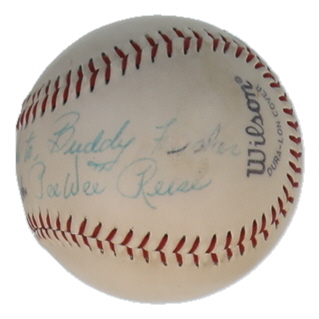 Wilson Official Little League Baseball. Hand-signed and inscribed by Pee Wee Reese (D. 1999, Brooklyn Dodgers, HOF). Inscription reads, "Good Luck to Buddy Fisher, Your Friend,". Please note, the ball is naturally toned and stained throughout.