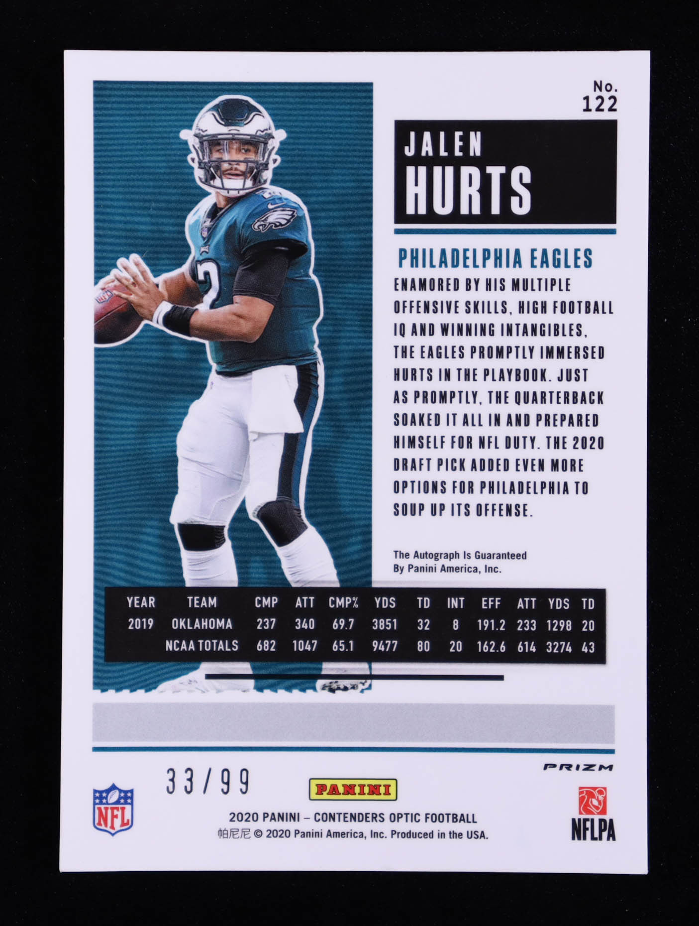 Jalen Hurts 2020 Panini Contenders Optic Teal #122 AU #33/99 RC