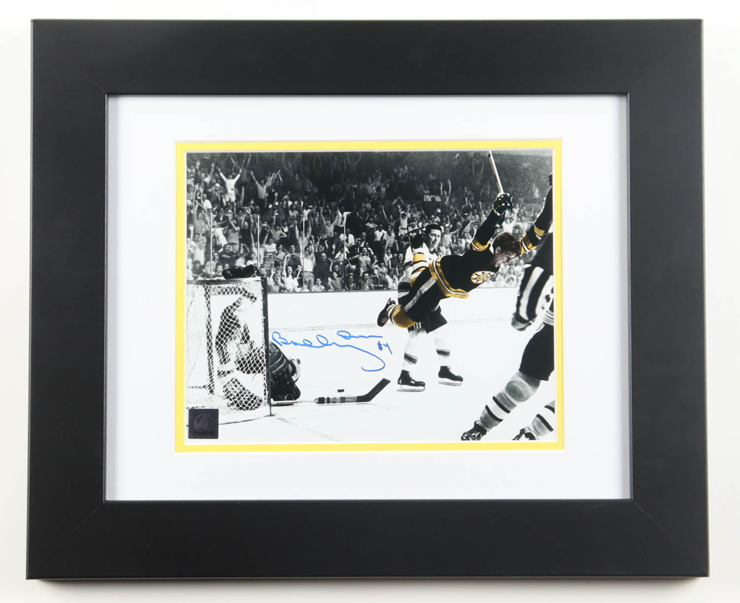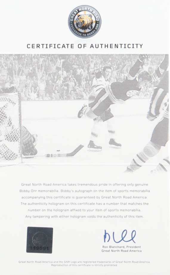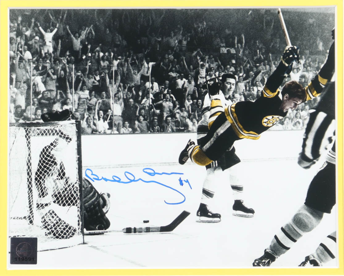 Custom frame measures approximately 14.5" x 17.5" in size. Hand-signed by Bobby Orr (Boston Bruins).