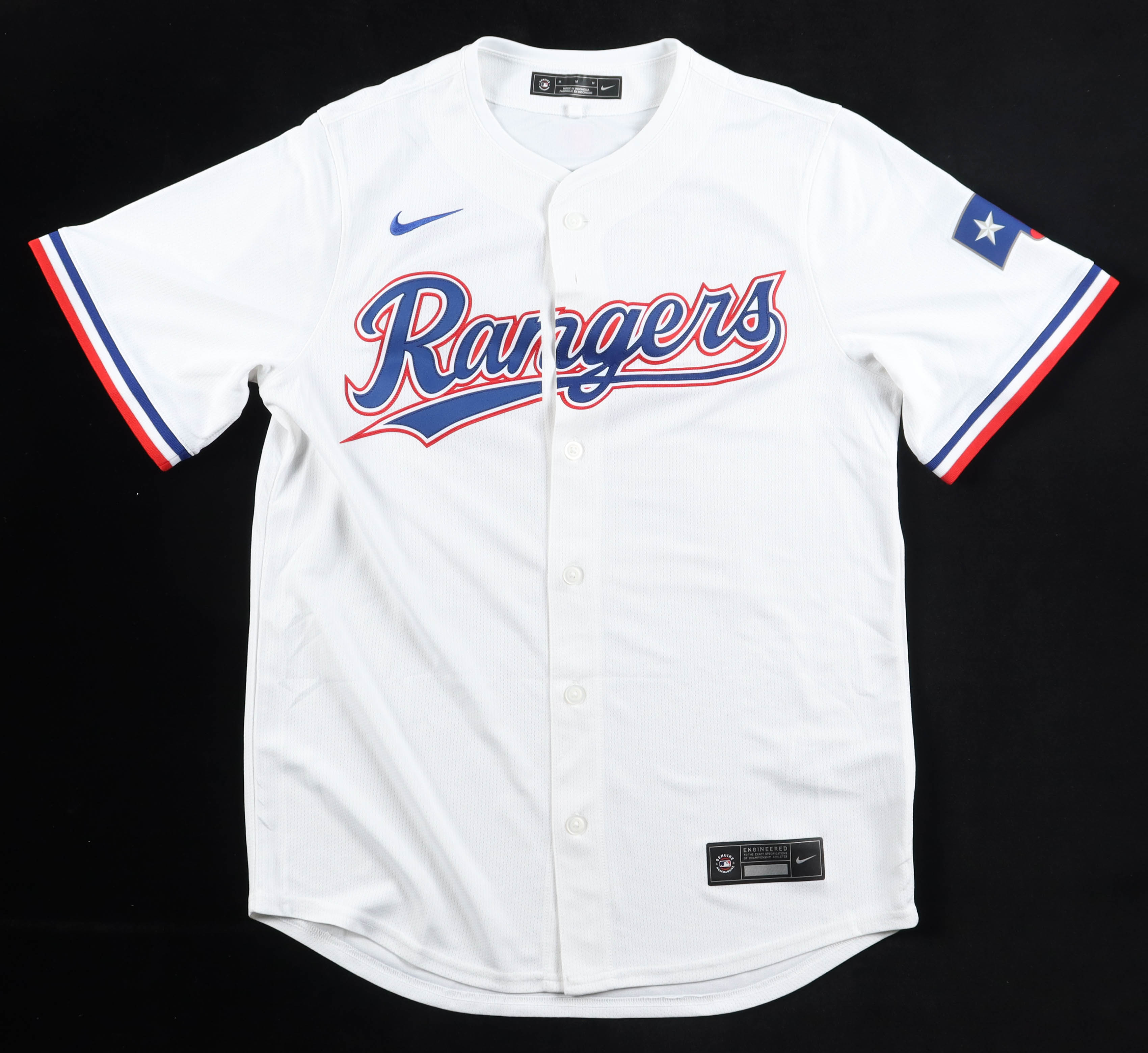 Nike authentic jersey with everything pressed and sewn on, size M. Hand-signed by Adrian Beltre (Texas Rangers).