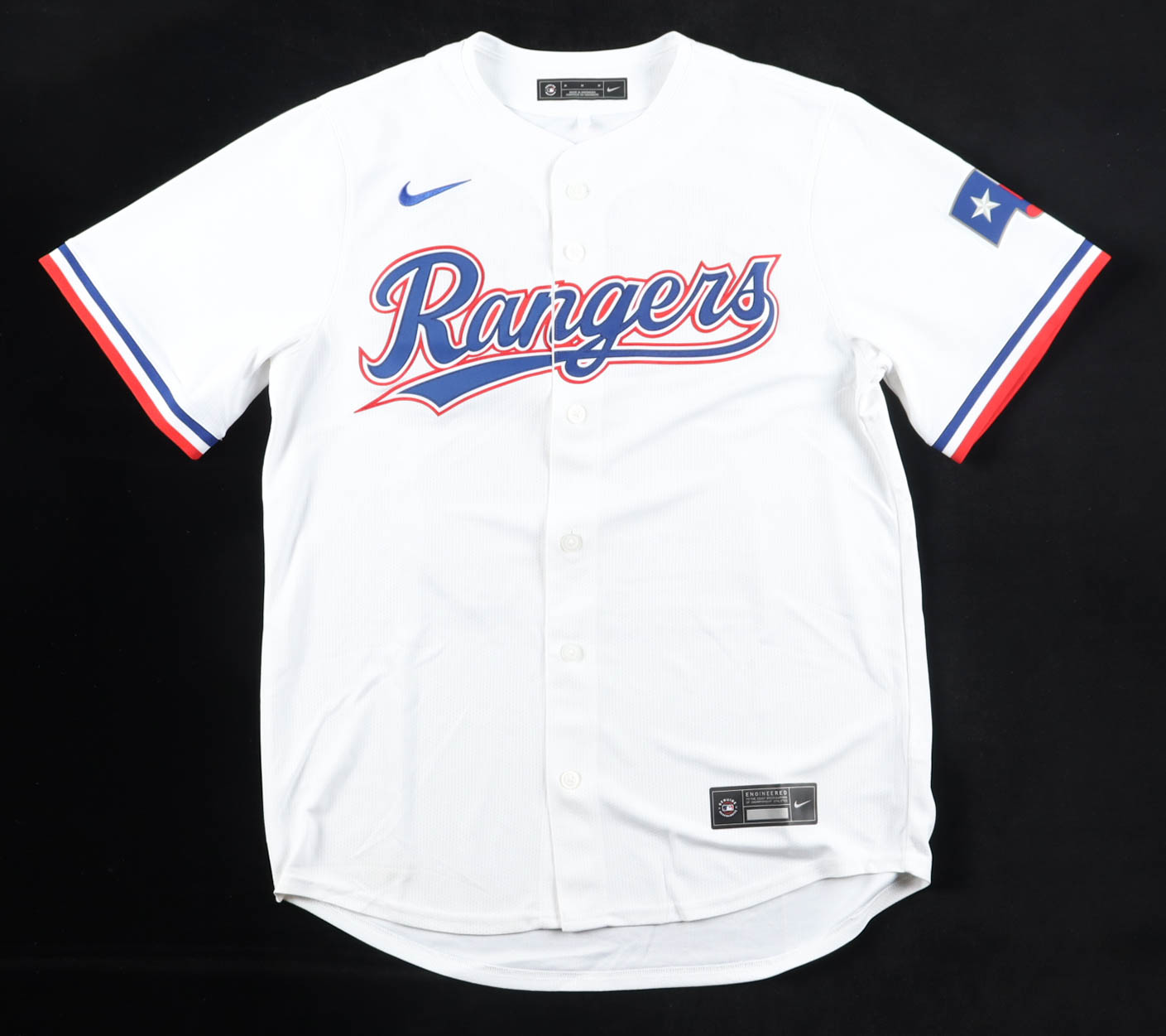 Nike authentic jersey with everything pressed and sewn on, size M. Hand-signed by Adrian Beltre (Texas Rangers).
