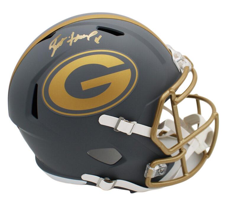 Riddell Green Bay Packers full-size slate alternate speed replica helmet. Hand-signed by Brett Favre (HOF).