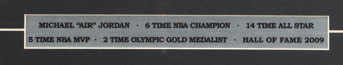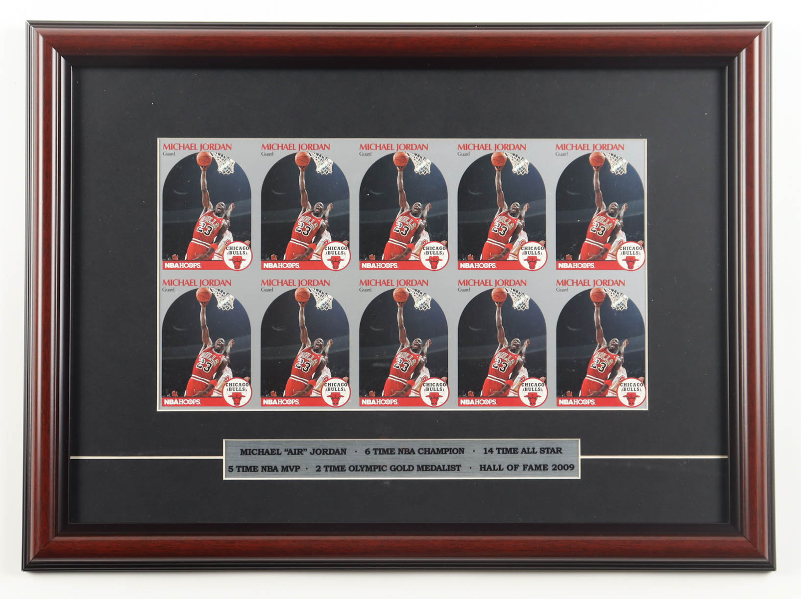 Custom frame measures approximately 14" x 18" in size and features an uncut 1990 Michael Jordan Hoops Basketball card sheet of (10) cards. Please see photos for more details regarding the condition of the item. Note that the item is unsigned.