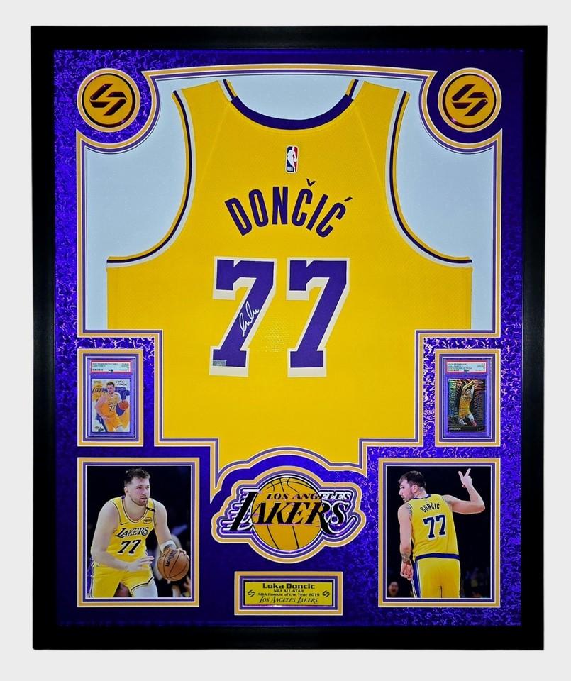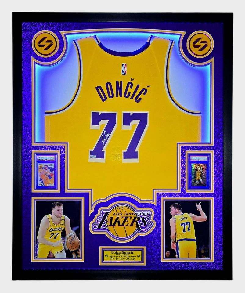 Luka Doncic Signed Lakers Custom Framed Nike Jersey with LED Display & (2) PSA 10 Graded Cards (Panini)